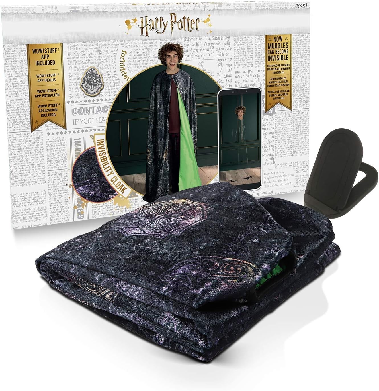 Wow Stuff te trae uno de los productos más impresionantes de Harry Potter, uno de esos que te acercan un poco de la magia del universo del mago a tu día a día para que te diviertas y te sorprendas. Se trata de… ¡la capa de invisibilidad! Dentro de una elegante caja negra viene una capa de tela decorada con motivos mágicos que recrean los de la auténtica capa de las películas. Incluye un código de activación que podrás usar en la aplicación oficial y grabar vídeos en los que te vuelves invisible. Para que funcione es necesario un dispositivo móvil o tablet con cámara incorporada y descargar la app. Hazte con tu capa de licencia oficial y pásatelo en grande poniéndote en la piel de Harry y usando uno de los objetos más icónicos de la saga cinematográfica.