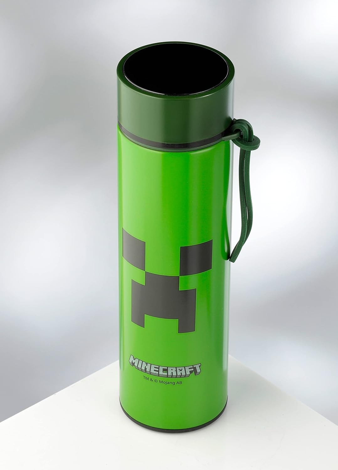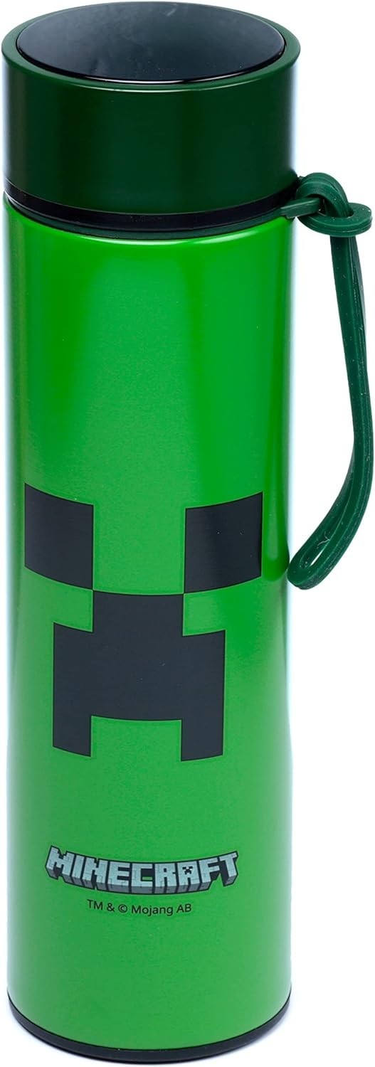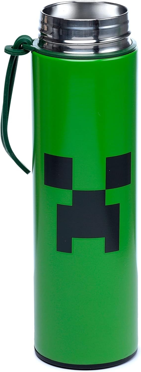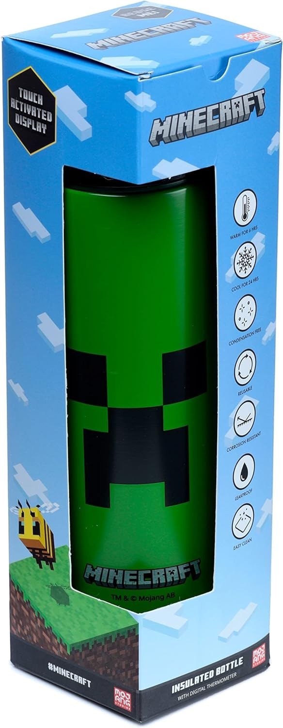 Adéntrate en el universo pixelado de Minecraft, el videojuego superventas de Mojang Studios, y llévate esta exclusiva botella térmica con temómetro digital. Es una creación de Puckator, tiene 450 mls, y tiene en la superficie la cara de un Creeper, con sus rasgos verdes y negros pixelados, como debe ser. Entre los increíbles atributos que tiene esta botella se encuentran que es de fácil limpieza, anti goteos, resistente a la corrosión, reutilizable, anti condensación y mantiene los líquidos calientes durante 6 horas y fríos durante 24 horas. Viene en una caja temática con ventana de exposición. Y atento, porque en la tapa hay un termómetro digital para que puedas consultar en todo momento la temperatura.