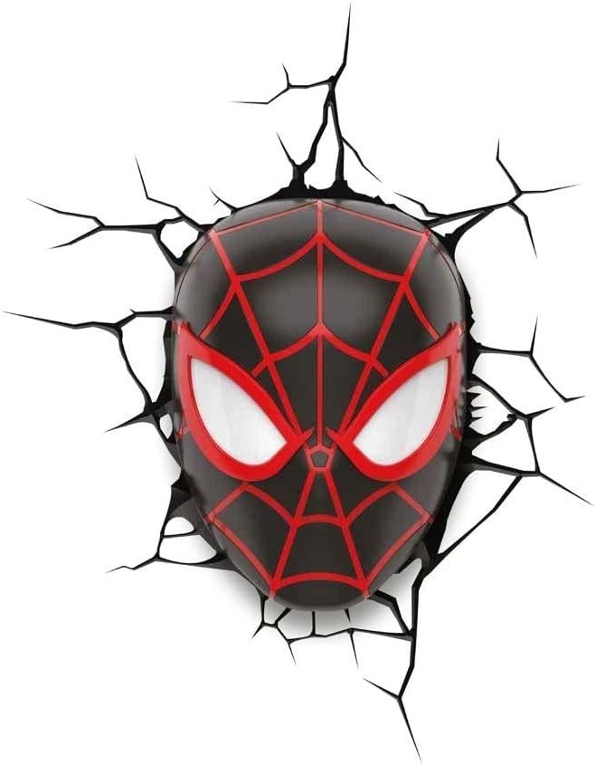 El trepamuros te dará luz desde tu mismísima pared. Uno de los Spider-Man más queridos de los cómics Marvel, Miles Morales, llega a tu casa con esta divertida lámpara 3D de tecnología LED. La máscara del Spider-Man de Miles es muy fácil de acoplar a tu pared con un tornillo y un taco. Una vez esté colocada y le hayas puesto las tres pilas AA que necesita (no vienen incluidas), podrás iluminar los ojos de Miles e iluminar tus noches. Las bombillas son LED y es una lámpara fría al tacto. Además, tiene la función de auto apagado después de 60 minutos encendida. Perfecta para luz nocturna para los peque fans del Hombre Araña. Está hecha por 3D Light FX. Viene en una caja temática con ventana expositora.
