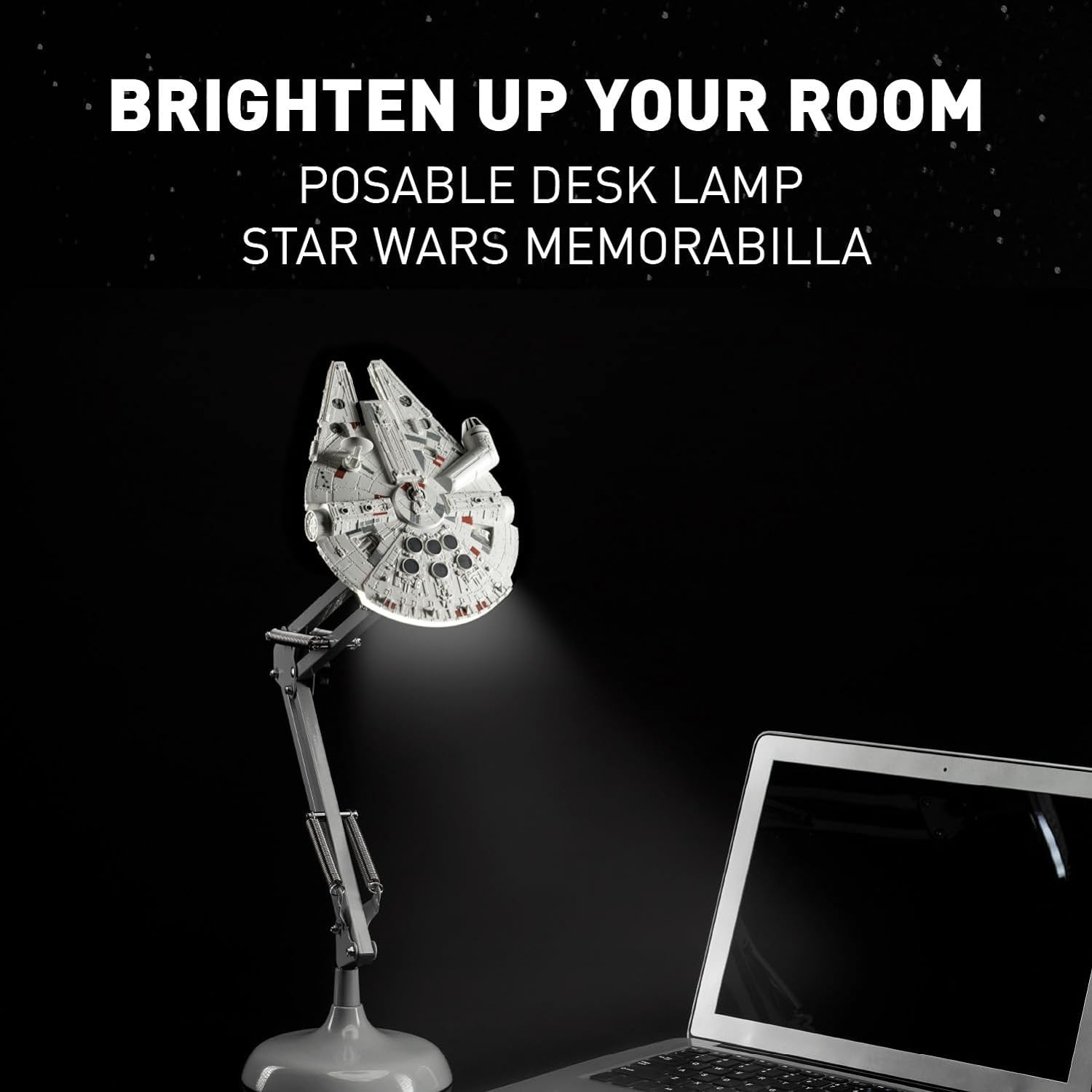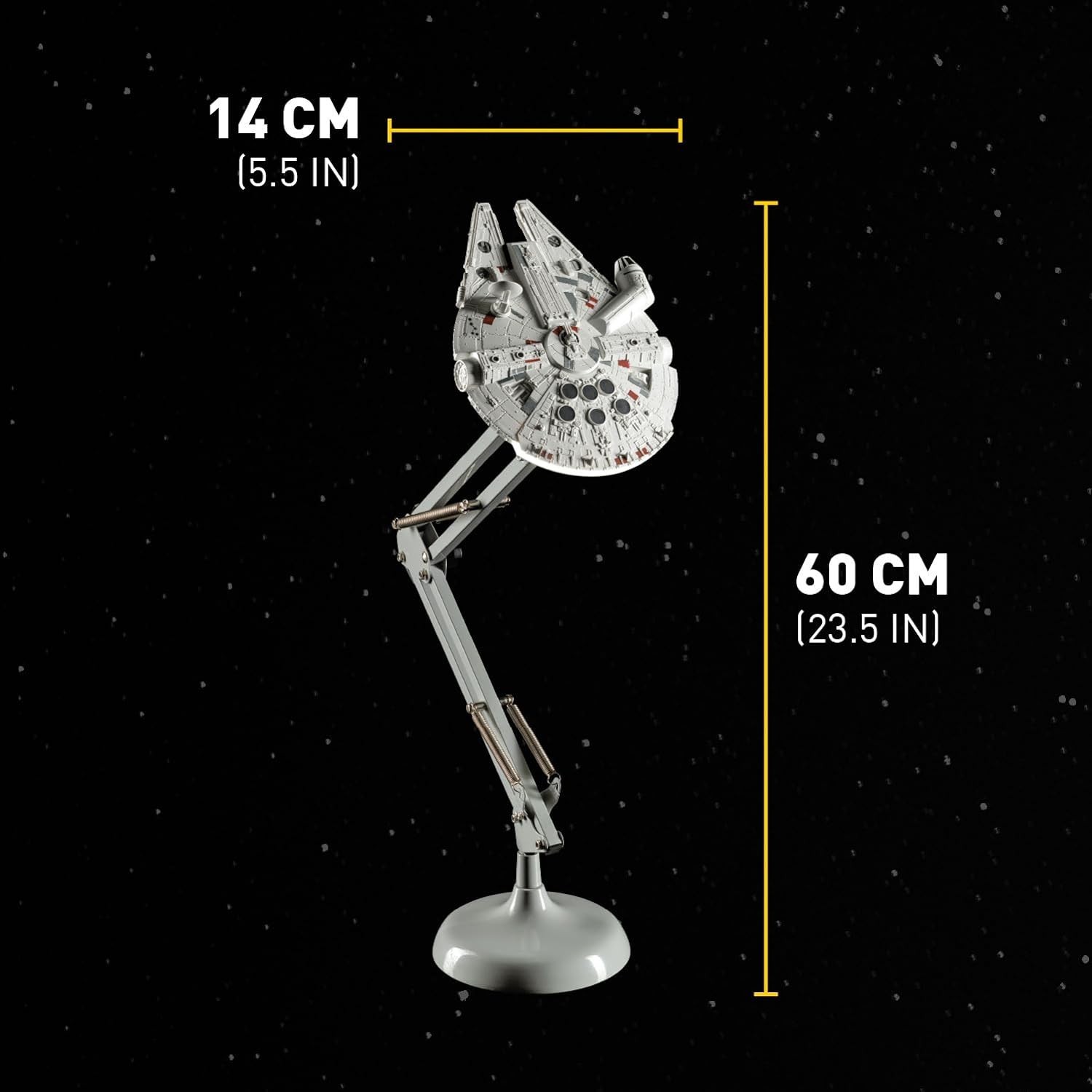 ¡Dale luz a tu nave con esta lámpara del Halcón Milenario! El legendario vehículo de Han Solo y Chewbacca te dará luz desde su parte trasera gracias a esta lámpara de metal de brazo flexible que se extiende hasta los 60 cms de altura. El Halcón está en el extremo del brazo, y gracias a un cable USB incluido te dará toda la luz que necesitas. Es una creación de Paladone de licencia oficial de Star Wars. Viene en una elegante caja negra. La réplica de la nave espacial está tan detallada que te quedarás embobado mirándola en lugar de hacer tus tareas, ¡ten cuidado!