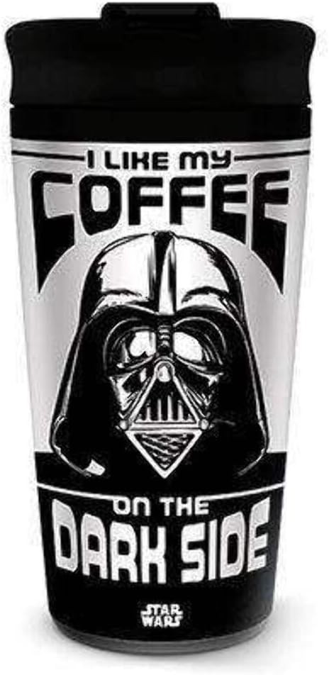 Haz de tus viajes un auténtico evento Sith con este espectacular vaso de aluminio y plástico de Darth Vader. Además de lleva ilustraciones del personaje, lleva la frase “l Like My Coffee On The Dark Side”. Es un producto de licencia oficial que ha creado Pyramid International y tiene una capacidad de 450 mls. ¿Listo para coger tu TIE Fighter y beber tu café o leche azul favorita?