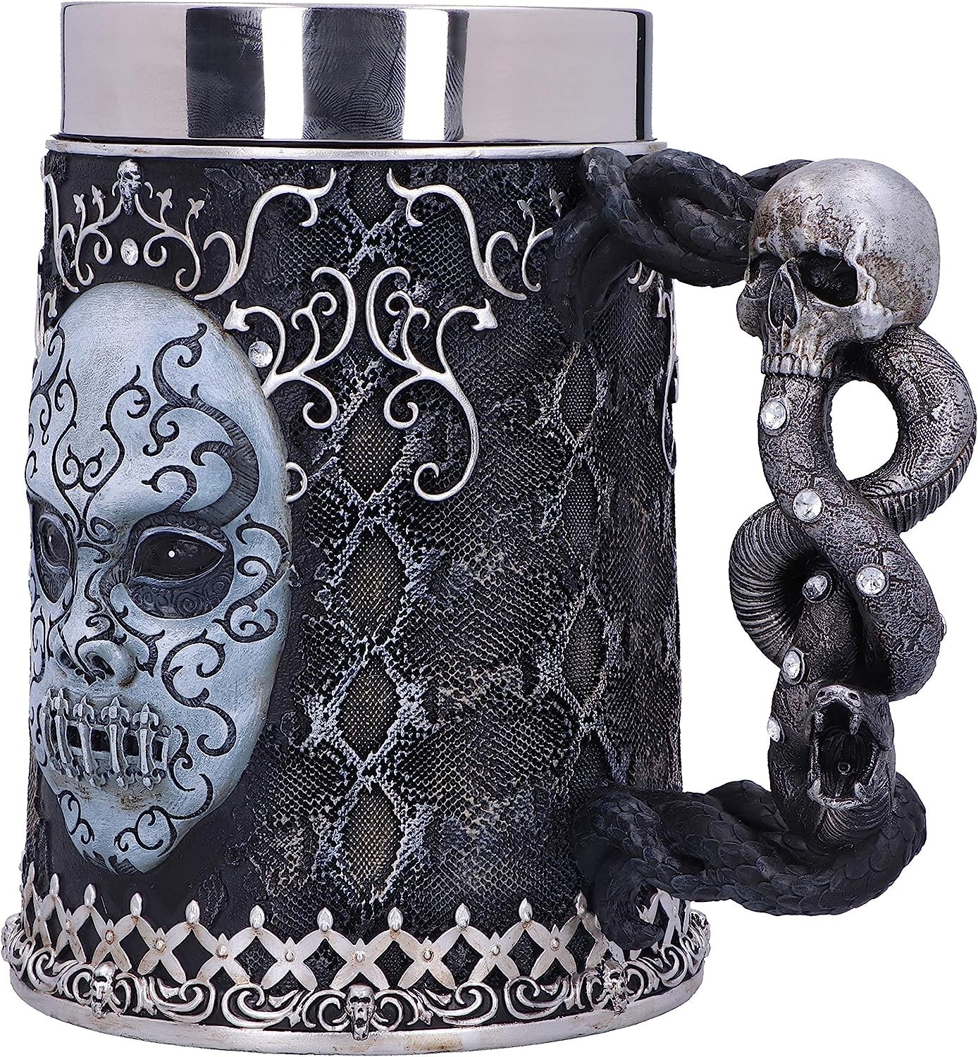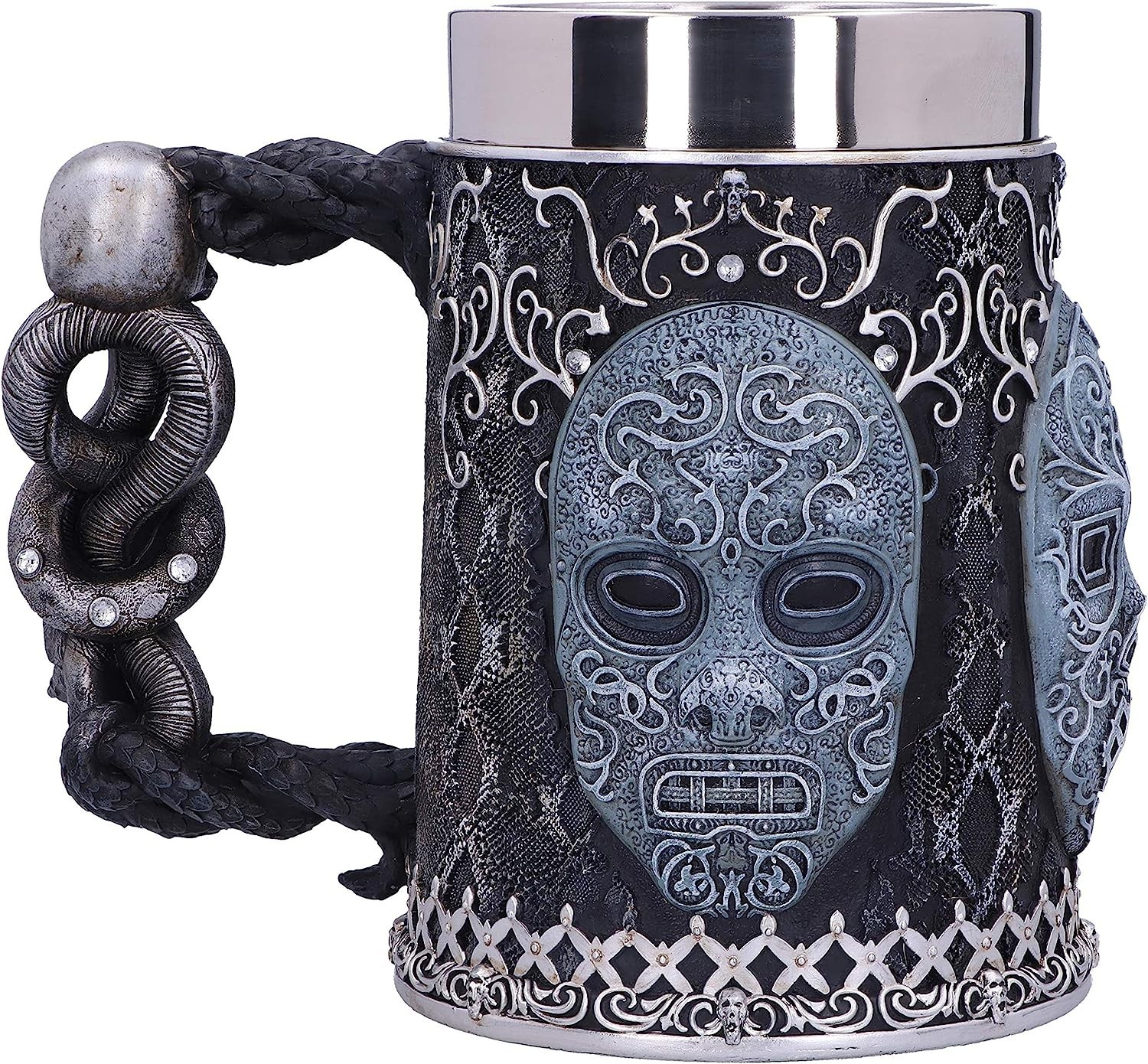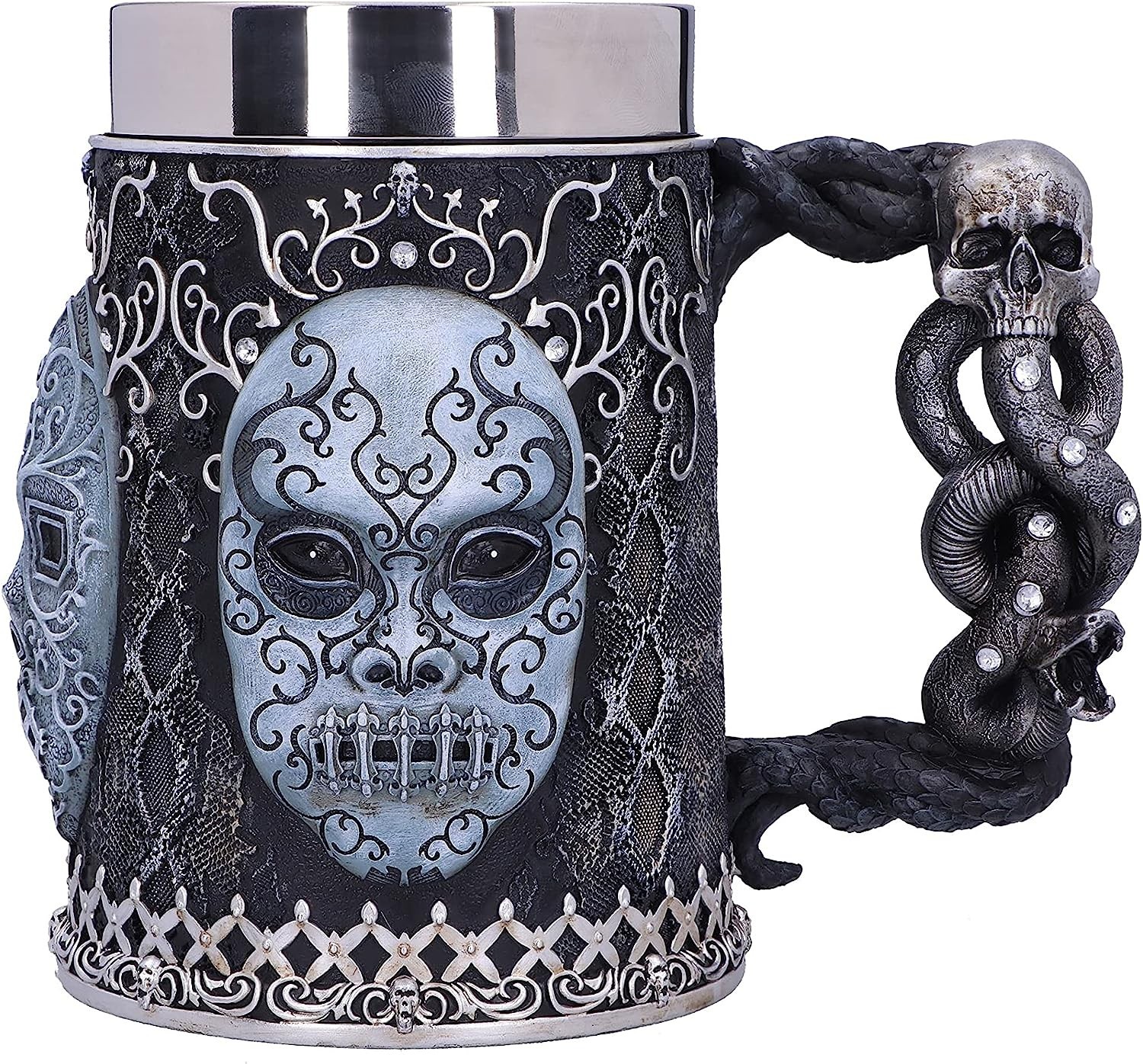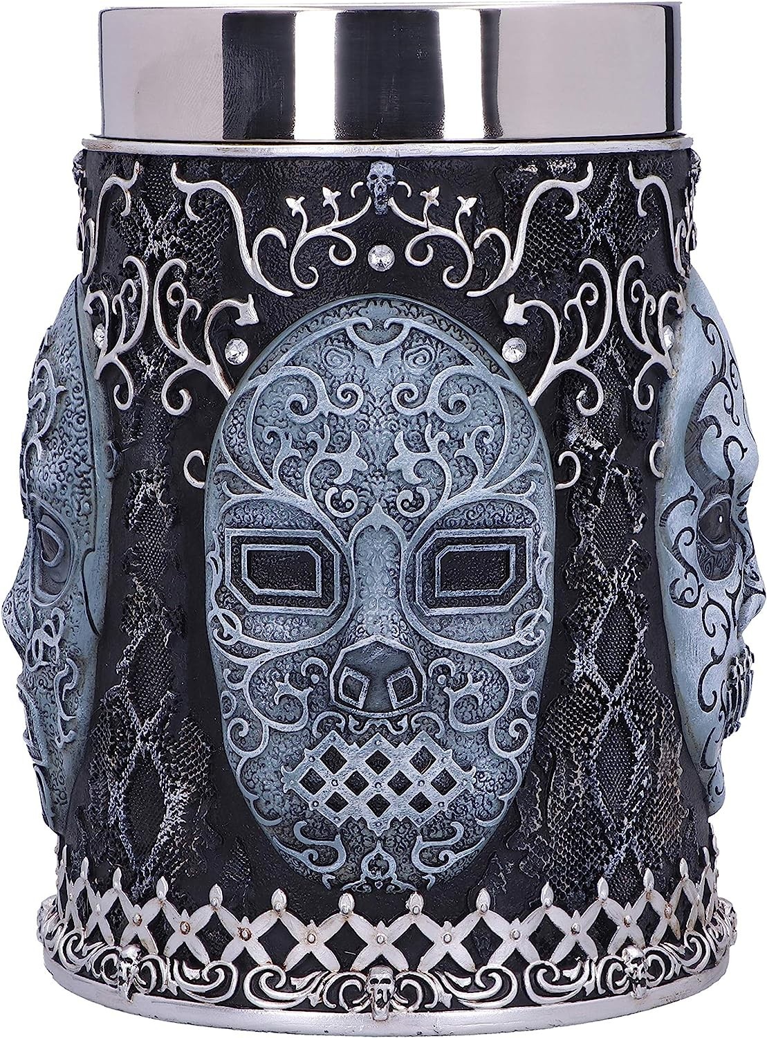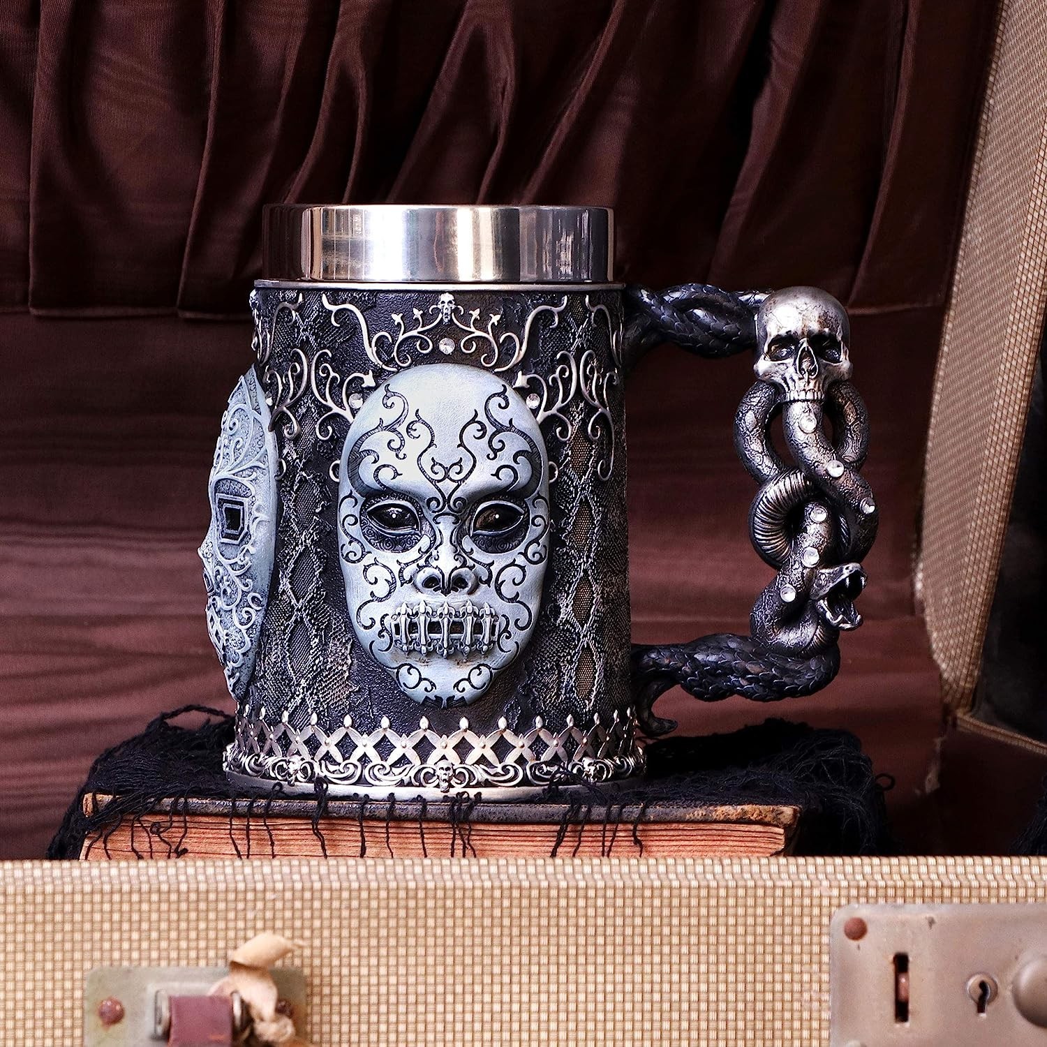 Los aliados de Voldemort también tenían sus accesorios para cuando se relajaban entre batallas. Ahora, gracias a Nemesis Now, puedes hacerte con una exclusiva jarra coleccionable de cerveza inspirada por estos siervos oscuros. La jarra de mortífago mide 15,5 cms y está hecha de acero inoxidable y polirresina que ha sido pintada a mano con un detalle increíble. Es un artículo de licencia oficial del Wizarding World y Harry Potter, y viene en una caja temática con una funda protectora. No es apta para lavavajillas ni microondas. El detalle de su asa con la calavera y las piedras incrustadas rivaliza en calidad sólo con el exquisito relieve de la superficie de la jarra, mostrando una de las aterradoras máscaras de los mortífagos.
