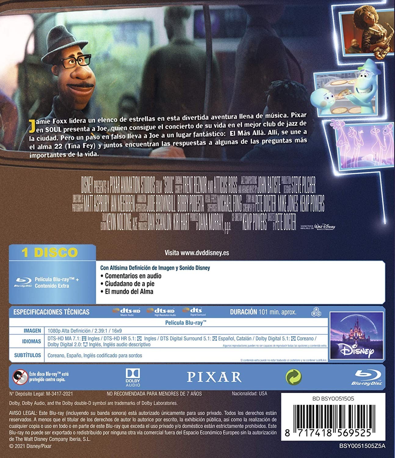 <div id="productDescription" class="a-section a-spacing-small"> <!-- show up to 2 reviews by default --><br /><h3> <span>Descripción del producto</span> </h3> <p> <span>Comentarios en Audio: (01:40:25) (Idiomas: Inglés) (Subtítulos: Español, Coreano, Inglés codificado para sordos) <br /> Ciudadano de a pie: (00:09:43) (Idiomas: Inglés) (Subtítulos: Español, Coreano, Inglés codificado para sordos). <br /> El Mundo del Alma: (00:08:15) (Idiomas: Inglés) (Subtítulos: Español, Coreano, Inglés codificado para sordos).</span> </p> <h3> <span>Sinopsis</span> </h3> <p> <span>Jamie Foxx lidera un elenco de estrellas en esta divertida aventura llena de música. Pixar en SOUL presenta a Joe, quien consigue el concierto de su vida en el mejor club de jazz de la ciudad. Pero un paso en falso lleva a Joe a un lugar fantástico: El Más Allá. Allí, se une al ama 22 y juntos encuentran las respuestas a algunas de las preguntas más importantes de la vida.</span> </p> </div>