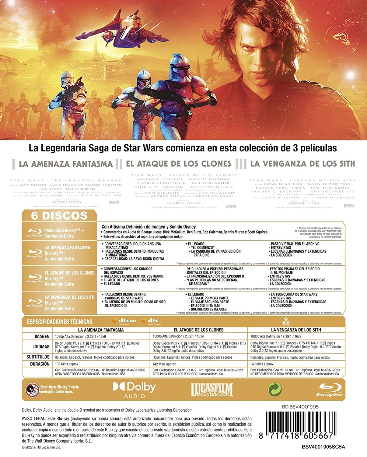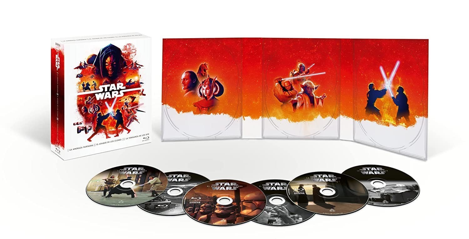 LA AMENAZA FANTASMA • Comentarios en Audio de George Lucas, Rick McCallum, Ben Burtt, Rob Coleman, Dennis Mures y Scott Squires • Entrevistas de archivo al reparto y al equipo de rodaje LA AMENAZA FANTASMA– DISCO DE BONUS: • CONVERSACIONES: DOUG CHIANG UNA MIRADA ATRÁS • HALLAZGOS DESDE DENTRO: MAQUETAS Y MINIATURAS • GEORGE LUCAS: LA REVOLUCIÓN DIGITAL • EL LEGADO EL ATAQUE DE LOS CLONES: • Comentarios en Audio de George Lucas, Rick McCallum, Ben Burtt, Rob Coleman, Dennis Mures y Scott Squires • Entrevistas de archivo al reparto y al equipo de rodaje EL ATAQUE DE LOS CLONES - DISCO BONUS: • CONVERSACIONES: LOS SONIDOS DEL ESPACIO • HALLAZGOS DESDE DENTRO: VESTUARIO • EL ARTE DEL ATAQUE DE LOS CLONES • EL LEGADO LA VENGANZA DE LOS SITH: • Comentarios en Audio de George Lucas, Rick McCallum, Ben Burtt, Rob Coleman, Dennis Mures y Scott Squires • Entrevistas de archivo al reparto y al equipo de rodaje LA VENGANZA DE LOS SITH – DISCO BONUS: • CONVERSACIONES: LA STAR WARS QUE CASI FUE • HALLAZGOS DESDE DENTRO: PARODIAS DE STAR WARS • EL LEGADO