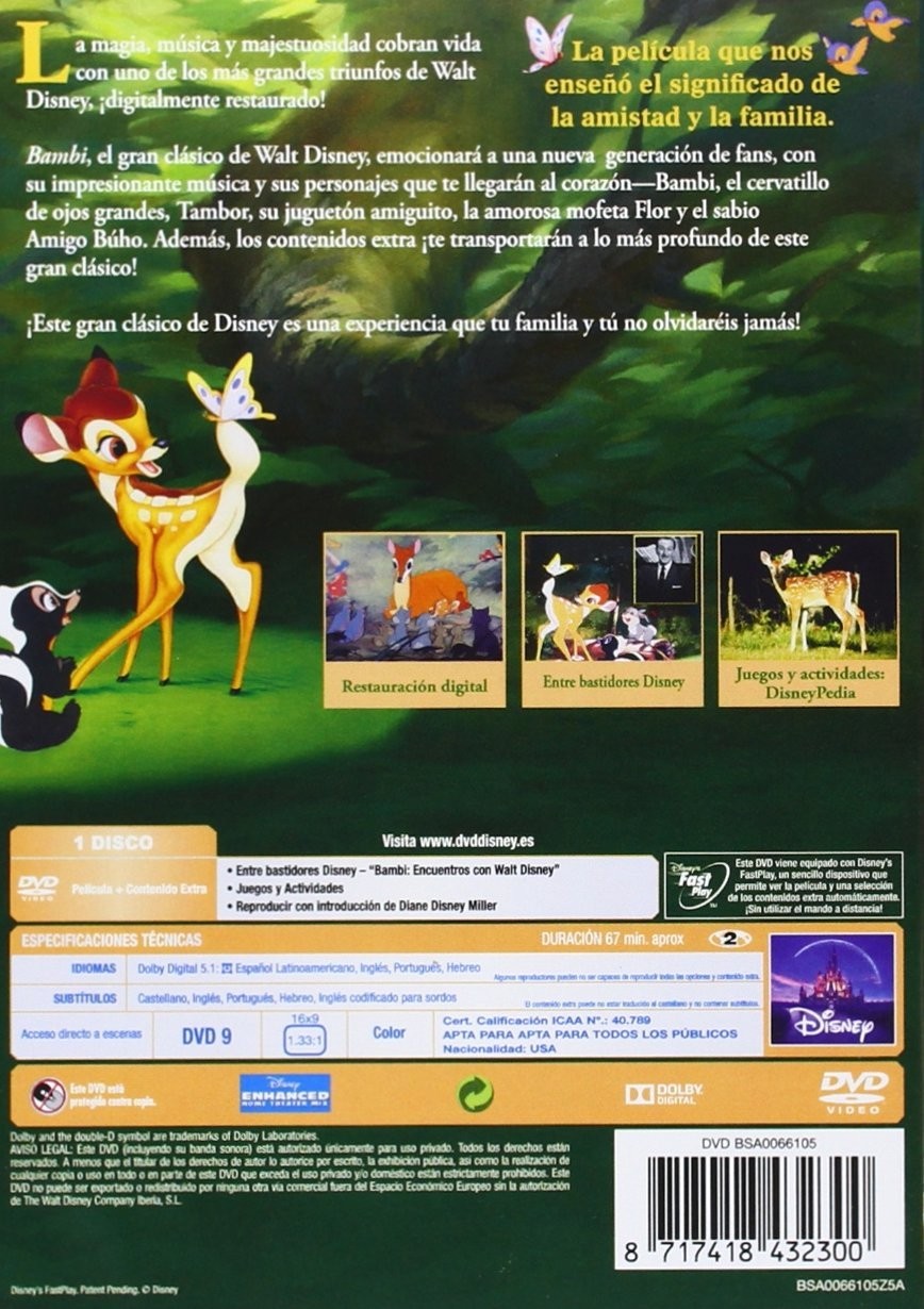 Bambi, el gran clásico de Walt Disney, emocionará a una nueva generación de fans, con su impresionante música y sus personajes que te llegarán al corazón—Bambi, el cervatillo de ojos grandes, Tambor, su juguetón amiguito, la amorosa mofeta Flor y el sabio Amigo Búho. Además, contenidos extra que ¡te transportarán a lo más profundo de este gran clásico!