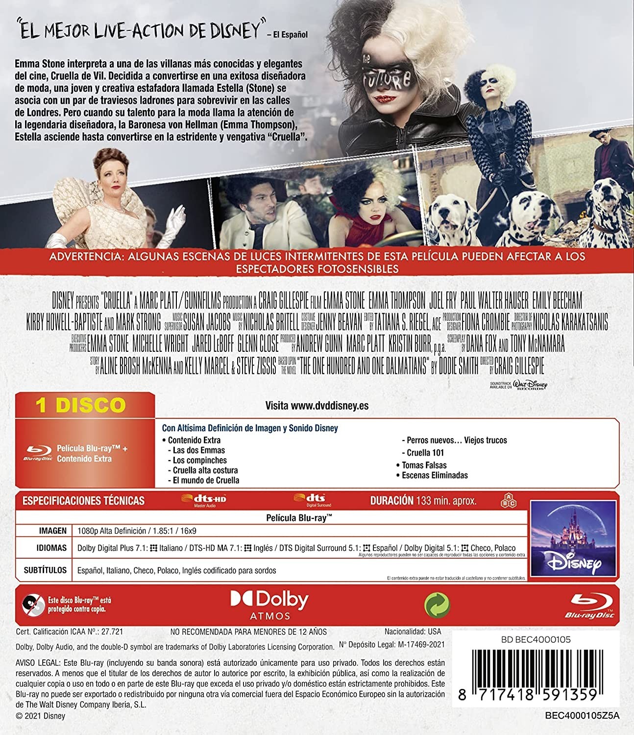 Emma Stone interpreta a una de las villanas más conocidas y elegantes del cine, Cruella de Vil. Decidida a convertirse en una exitosa diseñadora de moda, una joven y creativa estafadora llamada Estella se asocia con un par de traviesos ladrones para sobrevivir en las calles de Londres. Pero cuando su talento para la moda llama la atención de la legendaria diseñadora, la Baronesa von Hellman, Estella asciende hasta convertirse en la estridente y vengativa "Cruella".