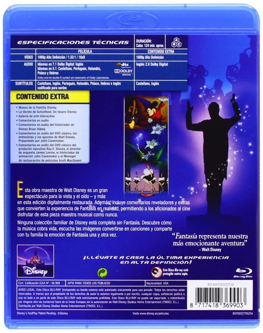 Todo un clásico de la Disney, una colección de interpretaciones animadas de grandes obras de música clásica. En "El Aprendiz de Brujo" (P. Dukas), Mickey Mouse, discípulo de un mago, se mete en un gran embrollo, pues sus conocimientos de magia son muy limitados. "La Consagración de la Primavera" (Stravinsky) cuenta la historia de la evolución, desde los seres unicelulares hasta la extinción de los dinosaurios. "La Danza de las Horas" (Ponchielli) es un fragmento de un ballet cómico interpretado por elefantes, hipopótamos, cocodrilos y avestruces. "Una Noche en el Monte Pelado" de Mussorgsky y el "Ave Maria" de Schubert describen el enfrentamiento entre la oscuridad y la luz.