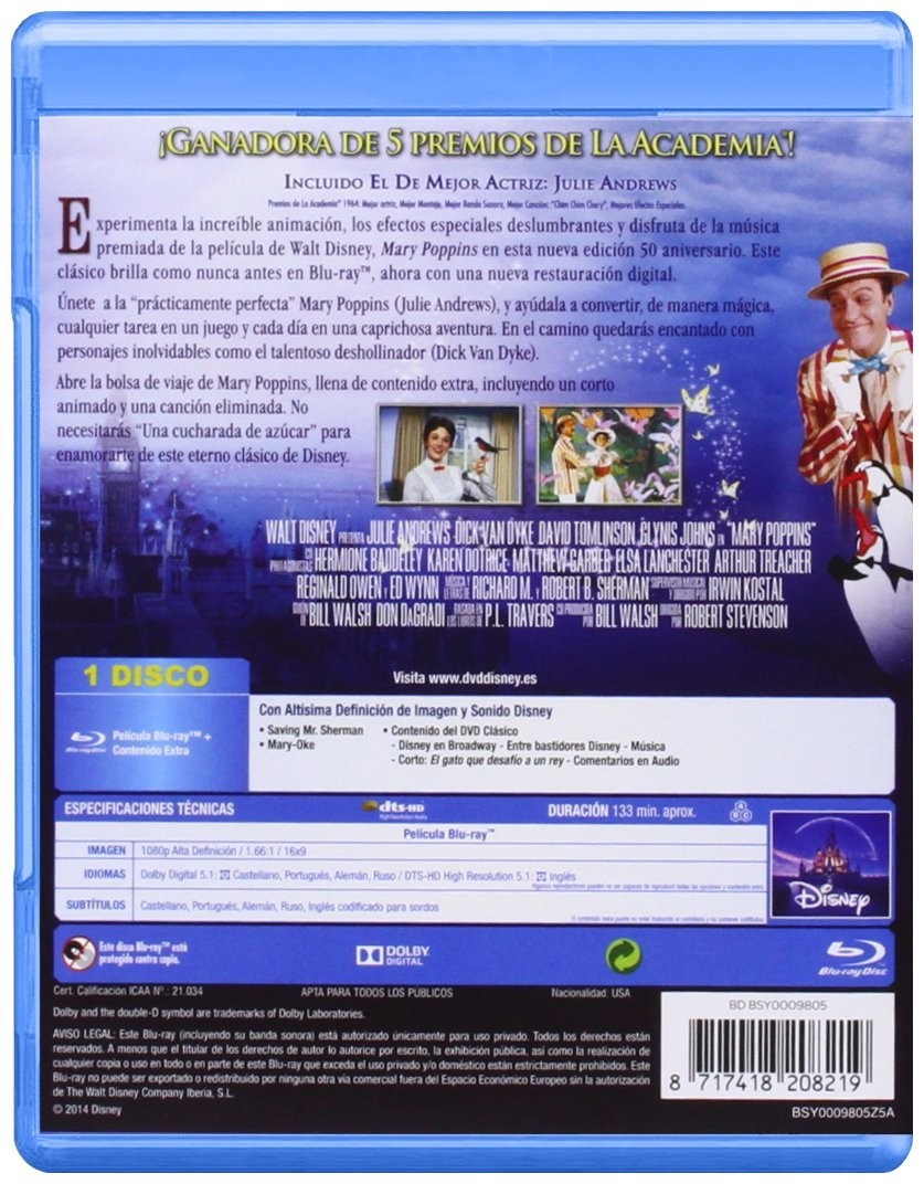 Experimenta la increíble animación, los efectos especiales deslumbrantes y disfruta de la música premiada de la película de Walt Disney, Mary Poppins en esta nueva edición 50 aniversario. Este clásico brilla como nunca antes en Blu-ray, ahora con una nueva restauración digital. Únete a la “prácticamente perfecta” Mary Poppins (Julie Andrews), y ayúdala a convertir, de manera mágica, cualquier tarea en un juego y cada día en una caprichosa aventura. En el camino quedarás encantado con personajes inolvidables como el talentoso deshollinador (Dick Van Dyke). Abre la bolsa de viaje de Mary Poppins, llena de contenido extra, incluyendo un corto animado y una canción eliminada. No necesitarás "Una cucharada de azúcar" para enamorarte de este eterno clásico de Disney.