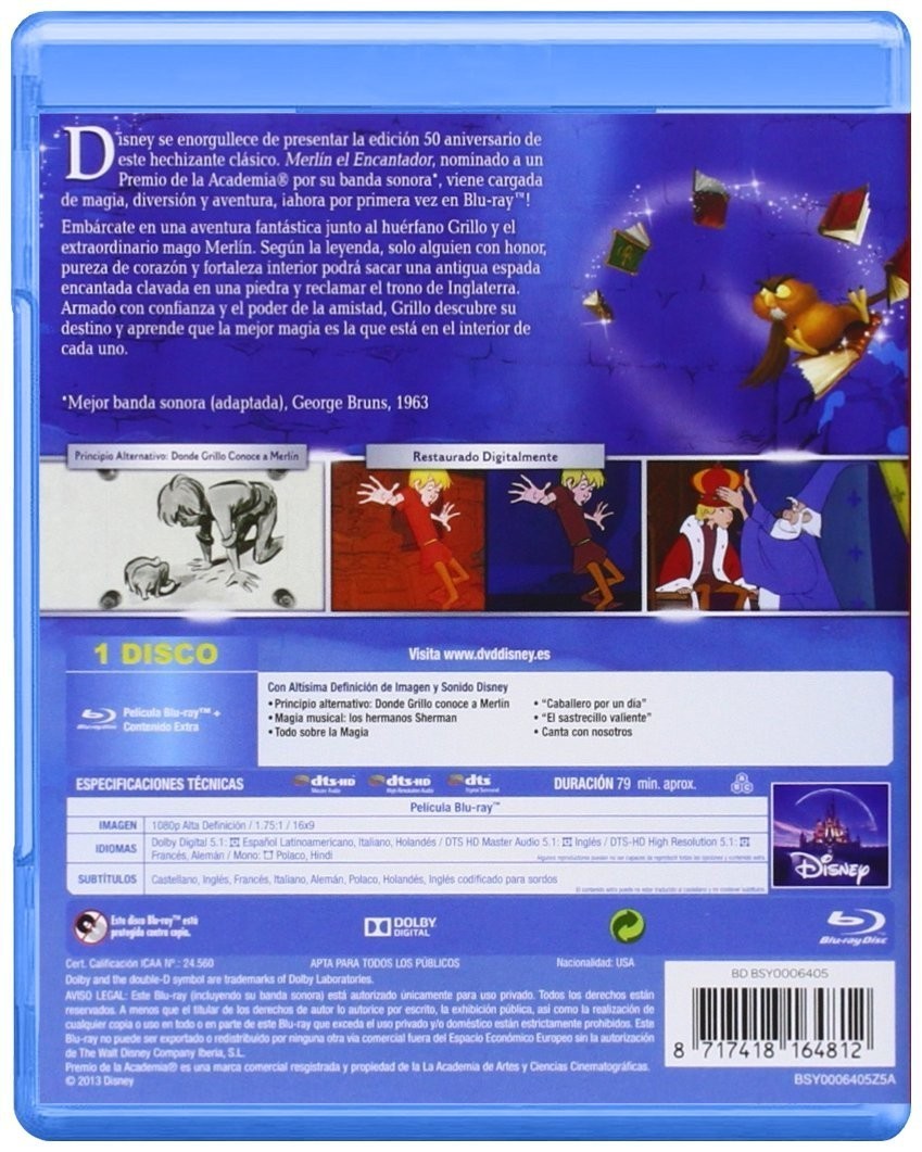 Disney se enorgullece de presentar la edición 50 aniversario de este hechizante clásico. Merlín el Encantador, nominada al Oscar por su banda sonora, viene cargada de magia, diversión y aventura, ¡ahora por primera vez en Blu-ray!Embárcate en una aventura fantástica junto al huérfano Grillo y el extraordinario mago Merlín. Según la leyenda, solo alguien con honor, pureza de corazón y fortaleza interior podrá sacar una antigua espada encantada clavada en una piedra y reclamar el trono de Inglaterra. Armado con confianza y el poder de la amistad, Grillo descubre su destino y aprende que la mejor magia es la que está en el interior de cada uno.
