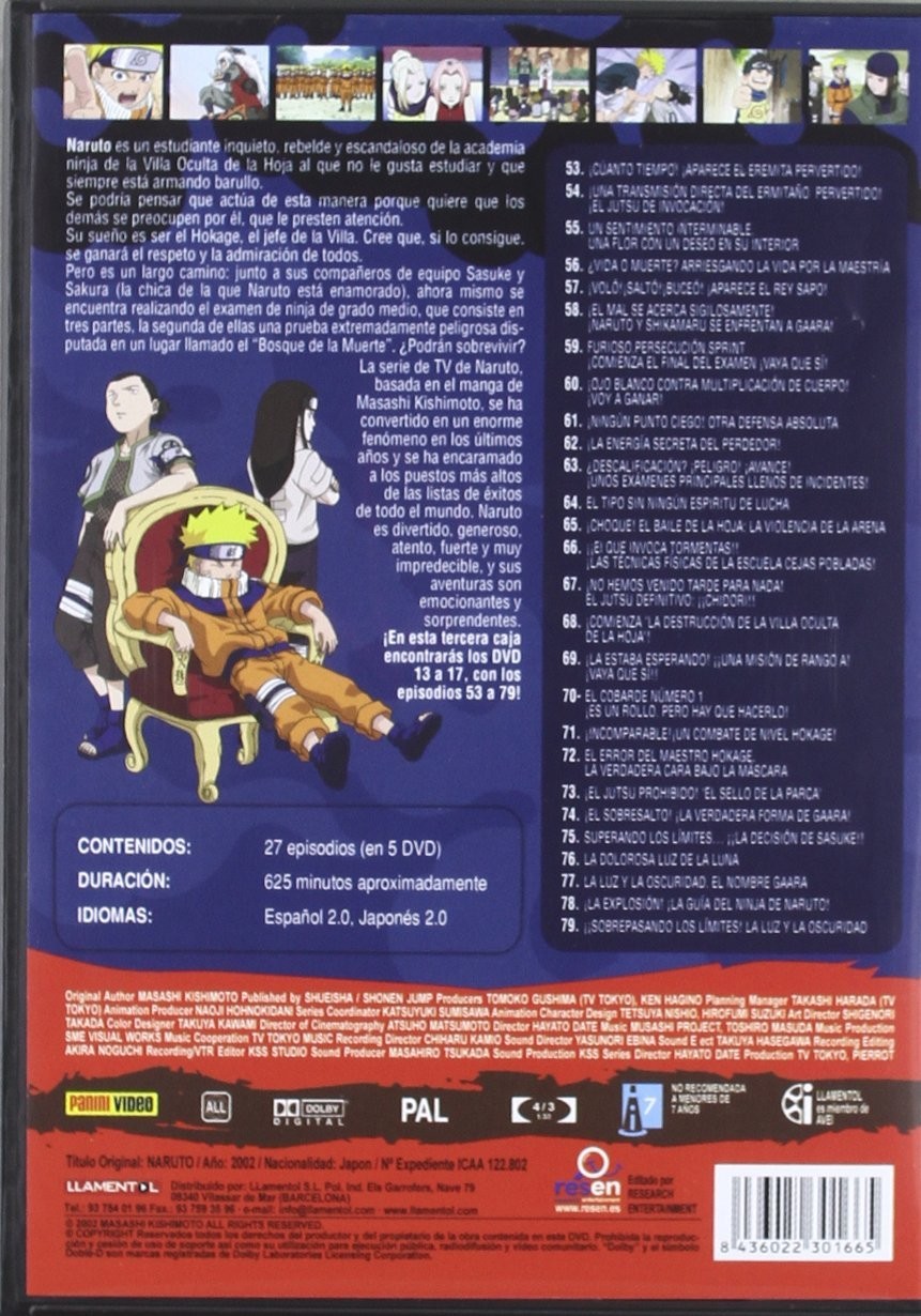 Naruto es un estudiante inquieto, rebelde y escandaloso de la academia ninja de la Villa Oculta de la Hoja al que no le gusta estudiar y que siempre está armando barullo. Se podría pensar que actúa de esta manera porque quiere que los demás se preocupen por él, que le presten atención. Su sueño es ser el Hokage, el jefe de la Villa. Cree que, si lo consigue, se ganará el respeto y la admiración de todos. Pero es un largo camino: junto a sus compañeros de equipo Sasuke y Sakura (la chica de la que Naruto está enamorado), ahora mismo se encuentra realizando el exámen de ninja de grado medio, que consiste en tres partes, la segunda de ellas es una prueba extremadamente peligrosa disputada en un lugar llamado el Bosque de la Muerte. ¿Podrán sobrevivir? Este pack contiene 27 episodios en 5 DVDs.