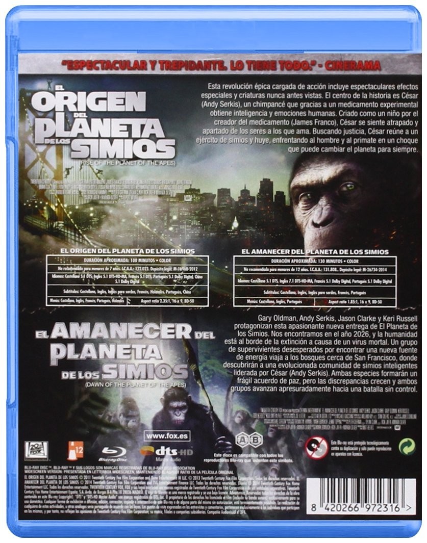 Este dúo incluye El Origen del Planeta de los Simios y El Amanecer del Planeta de los Simios. EL ORIGEN DEL PLANETA DE LOS SIMIOS: Precuela del ya mítico largometraje "El Planeta de los Simios". Will Rodman (James Franco) es un joven científico que está investigando con monos para obtener un tratamiento contra el Alzheimer, una enfermedad que afecta a su padre (John Lithgow). Uno de esos primates, un chimpancé recién nacido al que Will se llevó a casa para protegerlo, y al llama César (Andy Serkis), experimenta una evolución en su inteligencia verdaderamente sorprendente. En el estudio del simio le ayudará una bella primatóloga llamada Caroline (Freida Pinto).EL AMANECER DEL PLANETA DE LOS SIMIOS: Tras la aparición del devastador "virus de los simios" desarrollado en un laboratorio y que casi acabó con los humanos, un grupo de simios muy evolucionados, capitaneados por César, se han convertido en la raza dominante del planeta. La única amenaza para su desarrollo la representa un grupo de seres humanos que han sobrevivido al virus, al que ahora son inmunes. Los hombres necesitan la energía de una presa cerca del asentamiento de los simios, así que César, siempre razonable y buscando el bien de los suyos, firma una tregua de paz que evite estallar una guerra que determinará cuál será la raza dominante. Secuela de la película "El Origen del planeta de los Simios".Audio: Castellano 5.1 dts, Inglés 5.1 dts-hs-ma, Francés 5.1 dts, Alemán 5.1 dts, Portugués 5.1 dolby digital, Chino 5.1 dolby digital.