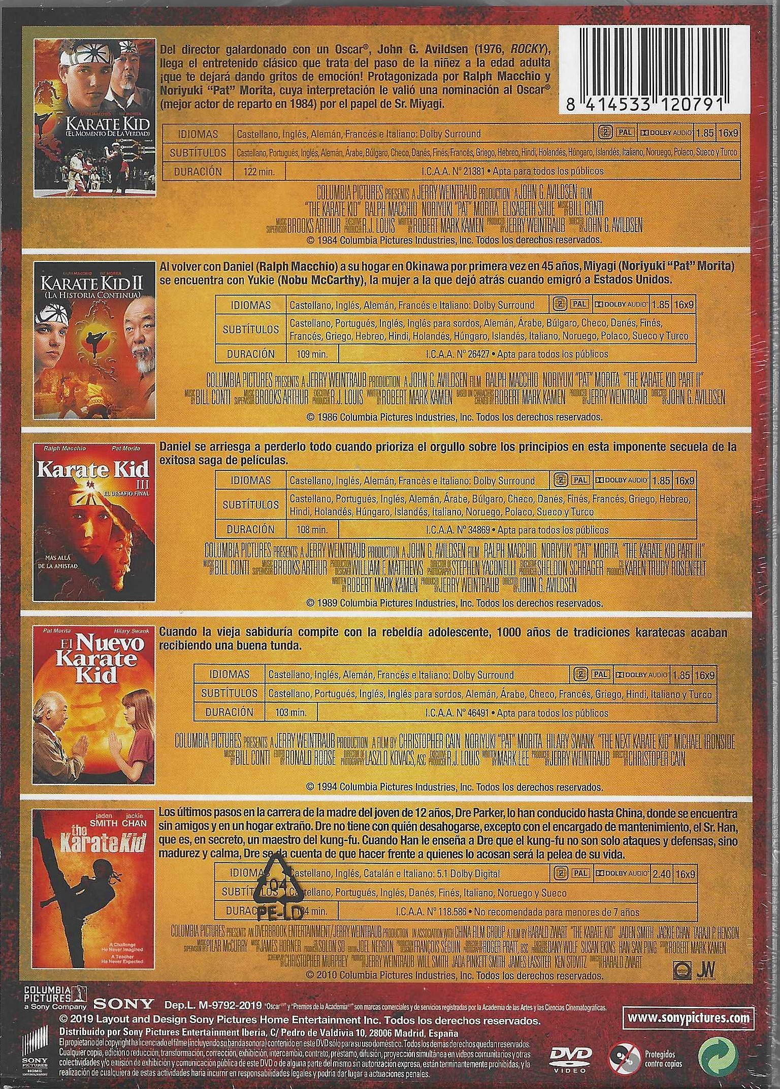 Daniel Larusso llega a Los Ángeles procedente de la costa Este de Estados Unidos dispuesto a hacer nuevos amigos. Sin embargo, se convierte en el blanco de los ataques de los Cobras, un hostil grupo de estudiantes de kárate, cuando comienza a salir con Ali, la antigua novia del cabecilla del grupo. En tal situación, no tiene más remedio que pedirle ayuda a Miyagi, un maestro de artes marciales, para que le enseñe kárate. Bajo la tutela de Miyagi, Daniel desarrolla no sólo sus aptitudes físicas, sino también la seguridad en sí mismo que necesita para superar todos los obstáculos. ,Daniel acompaña a Miyagi a su tierra, Okinawa. Para Daniel es un viaje a un mundo nuevo y exótico, donde aprenderá cosas sobre el pasado secreto de su maestro. Para Miyagi es la oportunidad de ver a su padre por última vez y de reanudar su romance con el amor de su infancia. Pero el regreso de Miyagi también reaviva su vieja enemistad son Sato, una enemistad que arrastrará a Daniel a un choque de culturas y combates. Ahora, lejos de los torneos, la energía del público y la seguridad del hogar, Daniel se enfrentará a su mayor desafío cuando el maestro se convierte en aprendiz y el precio del honor es la propia vida. ,El joven karateka Daniel Larusso libra su batalla mas difícil cuando el malvado Kreese le arrastra a una complicada situación, al obligarle a defender su título de campeón del torneo del Valley. Su maestro, Miyagi, no está de acuerdo..,Julie (Hilary Swank) perdió a sus padres cuando solo era una niña. Ahora, a sus diecisiete años, se ha convertido en una adolescente difícil, por lo que su abuela decide dejarla unas semanas bajo la tutela del señor Miyagi (Pat Morita), un antiguo amigo, con el fin de corregir su actitud. Por si fuera poco, la joven se convierte en el objetivo de Alpha Elite, un grupo de disciplina militar de su instituto al que deberá aprender a hacer frente.,Remake adaptado a la época contemporánea del clásico de los 80 "Karate Kid". Sigue la historia de Dre, un joven skateboarder que se muda a China con su madre soltera por motivos de trabajo. Cuando un matón local empieza a molestarle, el joven encontrará un apoyo en Mr. Han, un hombre que se ofrece a enseñarle artes marciales para defenderse de sus agresores.