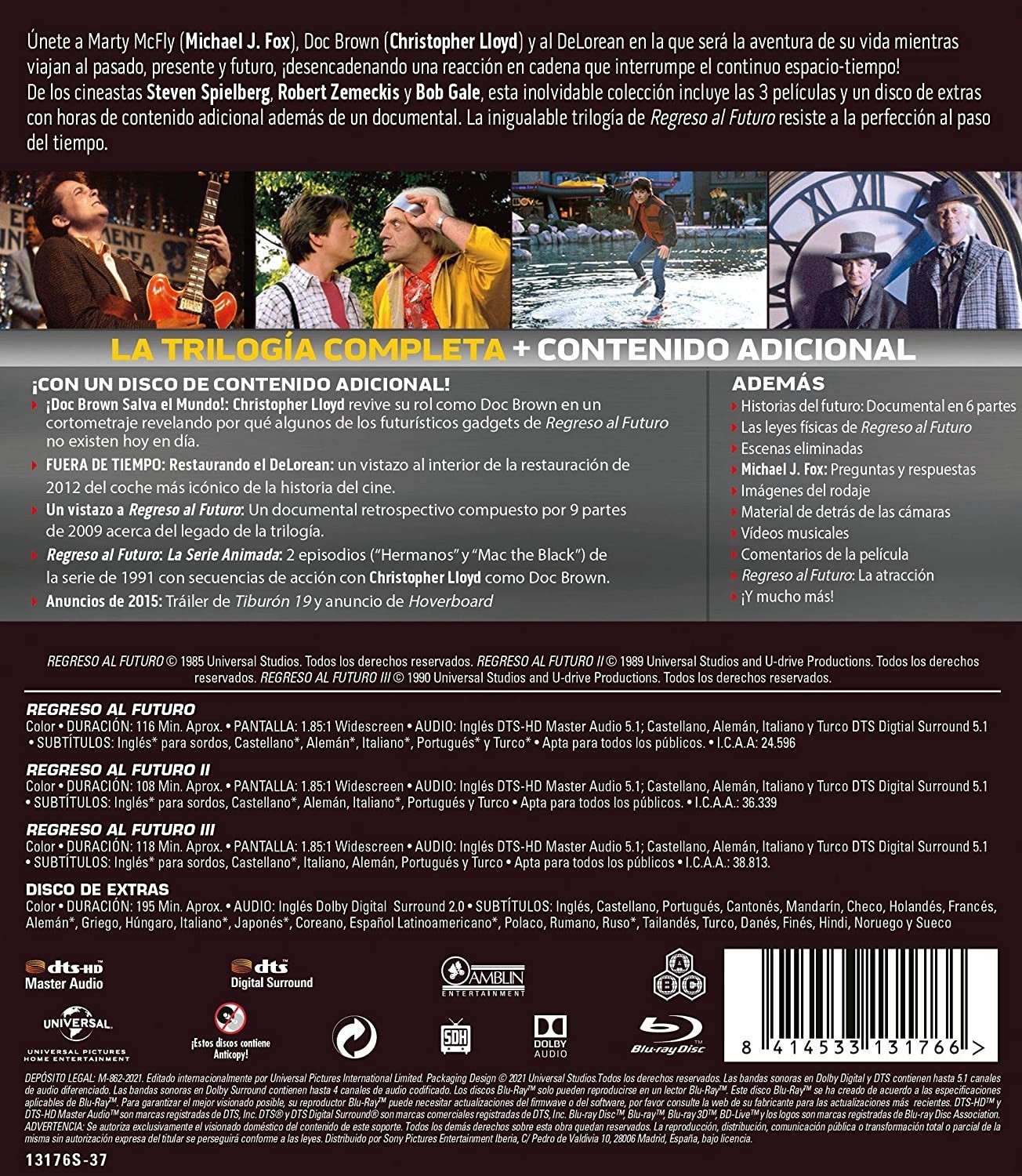 Únete a Marty McFly (Michael J. Fox), Doc Brown (Christopher Lloyd) y al DeLorean en una aventura en un viaje a través del pasado, presente y futuro, desencadenando una reacción en cadena que rompe el tiempo que interrumpe el continuo espacio-tiempo. De los cineastas Steven Spielberg, Robert Zemeckis y Bob Gale, esta colección presenta horas de contenido adicional en una trilogía que resiste a la perfección el paso del tiempo.