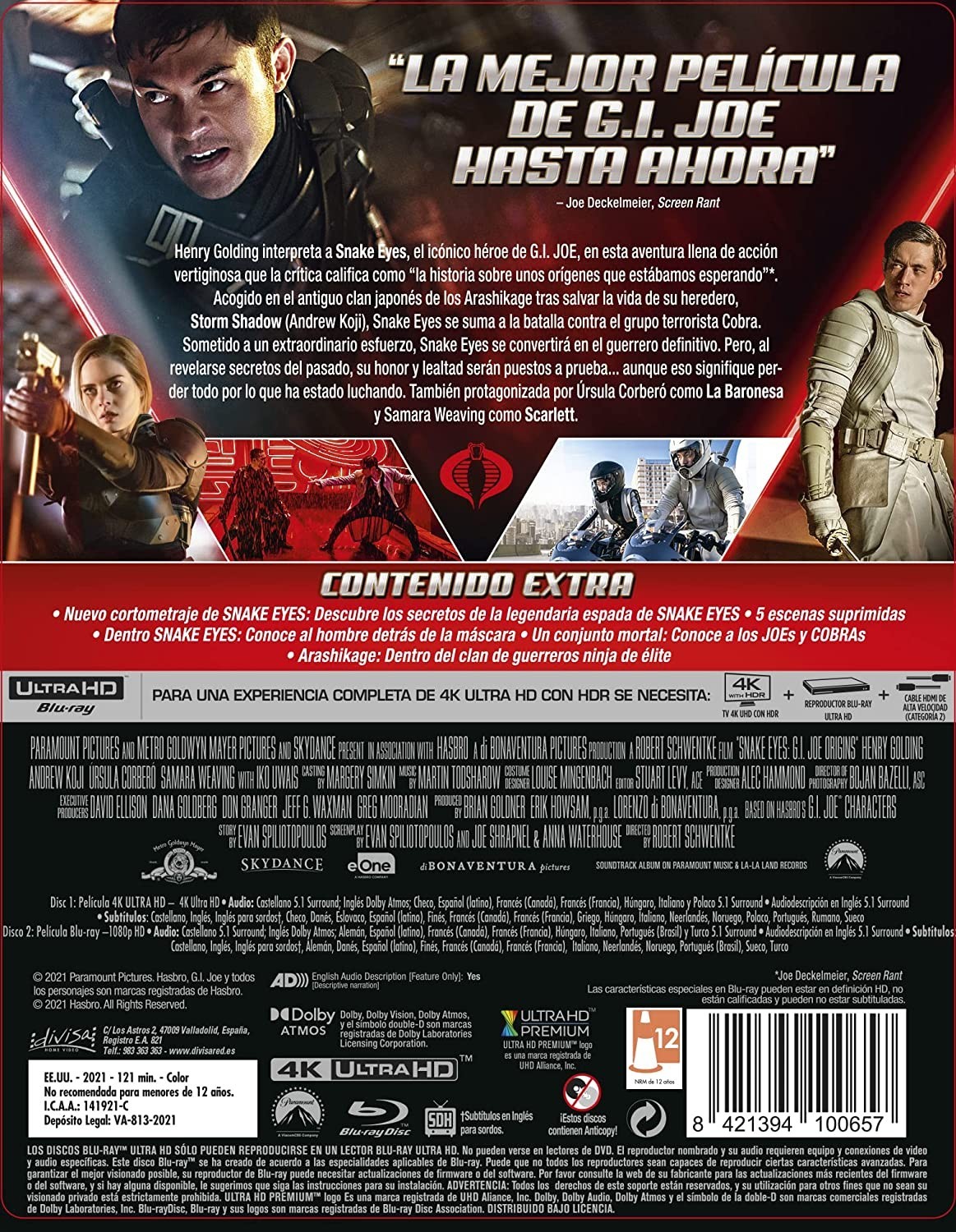 Descripción del producto Película de acción basada en la conocida línea de juguetes G.I. Joe. Este spin-off se centra en la historia de los orígenes de Snake Eyes (Henry Golding), el ninja silencioso siempre vestido de negro y del que no se conoce el rostro, y cómo intenta convertirse en miembro del clan Arashikage. Junto a él conoceremos otros personajes como La baronesa (Úrsula Corberó) y su archienemigo Storm Shadow (Andrew Koji). Sinopsis Snake Eyes es un tenaz guerrero solitario que, tras salvar la vida del heredero de los Arashikage, es acogido por este clan japonés. A su llegada a Japón, los Arashikage enseñan a Snake Eyes cómo convertirse en un guerrero ninja, al tiempo que le proporcionan algo que él anhela: un hogar. Pero cuando se revelan secretos de su pasado, el honor y la lealtad de Snake Eyes se pondrán a prueba, incluso si eso significa perder la confianza de sus allegados.