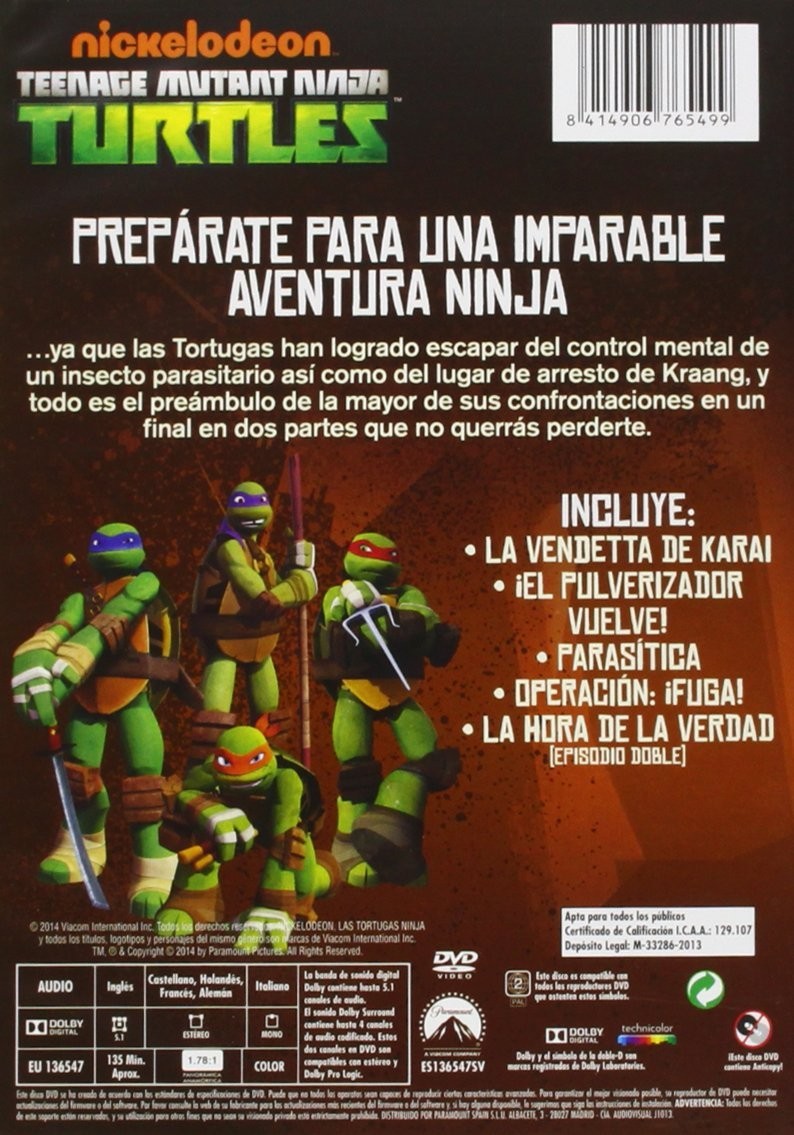 Prepárate para una imparable aventura ninja ya que las Tortugas han logrado escapar del control mental de un insecto parasitario así como del lugar de arresto de Kraang, y todo es el preámbulo de la mayor de sus confrontaciones en un final es dos partes que no querrás perderte. Apodo: Mikey Sexo: Masculino Color del Antifaz: Naranja Lugar de Residencia: Las Alcantarillas de Nueva York Trabajo: Ninja, Adolescente Personalidad: Bobalicón, Intenso, Encantador Pasatiempo Preferido: Patinaje, Poner nombre a las cosas, Comer Pizza Habilidades Ocultas: Hacer creaciones culinarias como tarta de algas con gusanos y batidos de pizza, también conocidos como P-batido. Arma Distintiva: Nunchuks Michelangelo destaca por sus trucos y acrobacias, especialmente cuando utiliza sus nunchuks. A diferencia de otras armas, los nunchuks resultan perfectos para golpear y atrapar el arma de tu oponente o sus extremidades. También son estupendas para coger velocidad y desorientar a tu enemigo en sus golpes y defensa. Es irónico que Mikey, la Tortuga más distraída, tenga el arma que más distrae. Físicamente la más pequeña y la menos madura, Mikey se distrae muy fácilmente y se entusiasma con bueno con cualquier cosa. También es muy creativa. Tiene mil ideas y de vez en cuando alguna resulta brillante. Su combinación de creatividad y falta de concentración le da una especie de 'inspiración' que las otras Tortugas no pueden igualar. Se trata de un animal social (bueno, mutante) que, mucho más que los otros, ansía formar parte del mundo real.