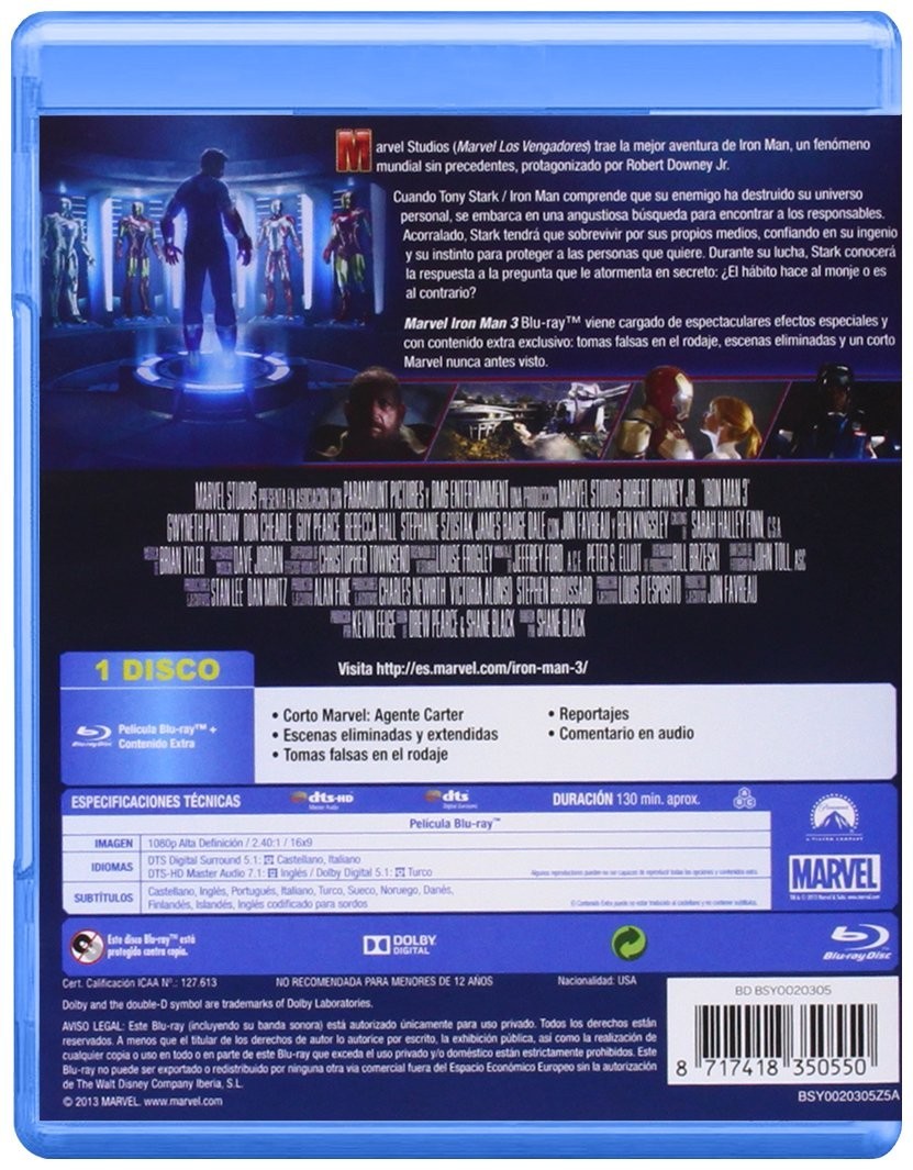 Marvel Iron Man 3 Blu-ray viene cargado de espectaculares efectos especiales y con contenido extra exclusivo: tomas falsas en el rodaje, escenas eliminadas y un corto Marvel nunca antes visto.