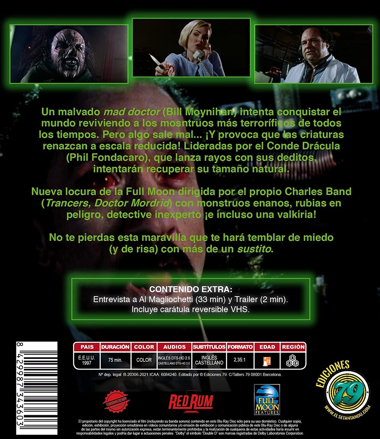 Extras: Entrevista a Al Magliochetti (33 min) y Trailer (2 min) Incluye carátula reversible VHS . Drácula. Frankenstein. El Hombre Lobo. La Momia. Han vuelto a la vida. Los monstruos más terroríficos de la historia están vivos de nuevo gracias a los experimentos de un científico. Pero los experimentos no han sido perfectos. Un error de cálculo provoca que las criaturas hayan resucitado a escala reducida. Enfurecidas, harán todo lo posible para recuperar el tamaño natural.