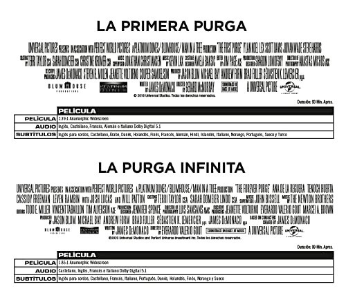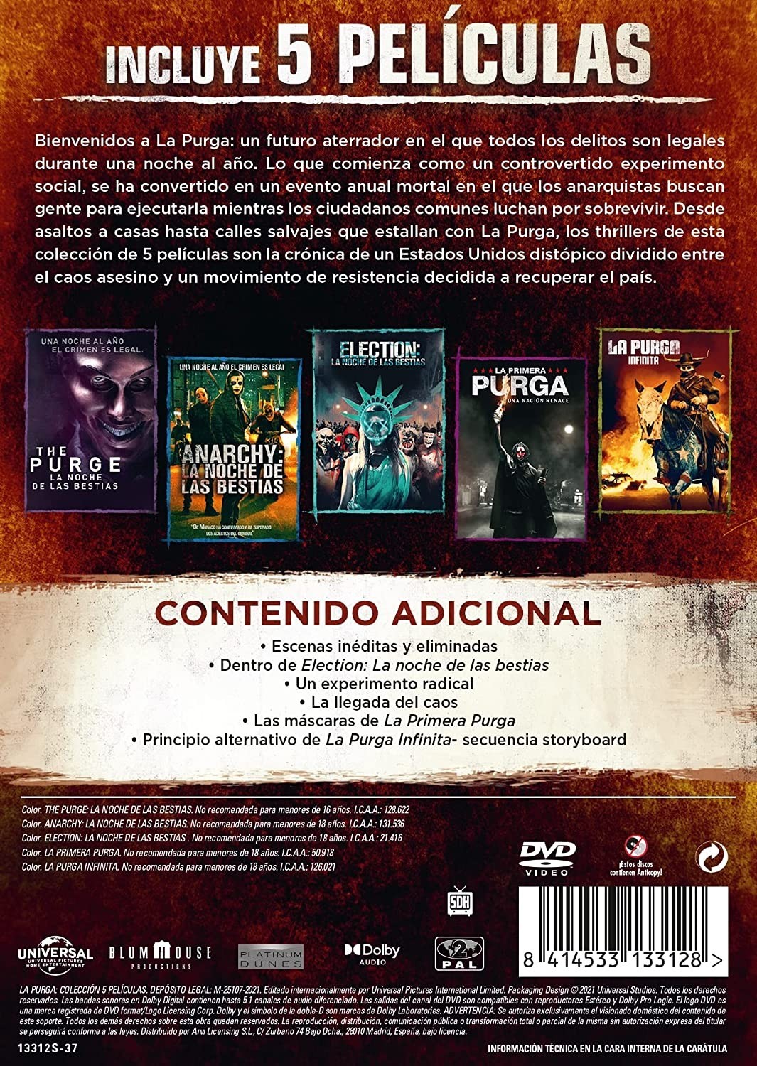 Bienvenidos a La Purga: un futuro aterrador en el que todos los delitos son legales durante una noche al año. Lo que comienza como un controvertido experimento social, se ha convertido en un evento anual mortal en el que los anarquistas buscan gente para ejecutarla mientras los ciudadanos comunes luchan por sobrevivir. Desde asaltos a casas hasta calles salvajes que estallan con La Purga, los thrillers de esta colección de 5 películas son la crónica de un Estados Unidos distópico dividido entre el caos asesino y un movimiento de resistencia decidida a recuperar el país.