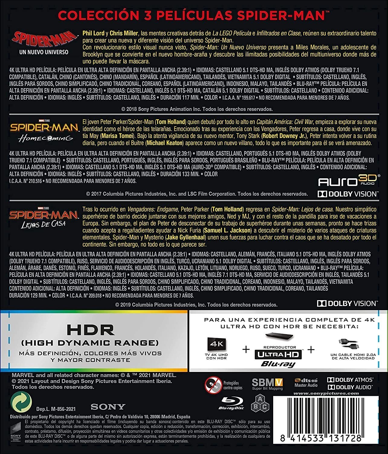 Peter Parker (Tom Holland) comienza a experimentar su recién descubierta identidad como el superhéroe Spider-Man. Después de la experiencia vivida con los Vengadores, Peter regresa a casa, donde vive con su tía (Marisa Tomei). Bajo la atenta mirada de su mentor Tony Stark (Robert Downey Jr.), Peter intenta mantener una vida normal como cualquier joven de su edad, pero interrumpe en su rutina diaria el nuevo villano Vulture (Michael Keaton) y, con él, lo más importante de la vida de Peter comenzará a verse amenazado. ,Peter Parker decide irse junto a MJ, Ned y el resto de sus amigos a pasar unas vacaciones a Europa. Sin embargo, el plan de Parker por dejar de lado sus superpoderes durante unas semanas se ven truncados cuando Nick Fury contacta con él para solicitarle ayuda para frenar el ataque de unas criaturas elementales que están causando el caos en el continente. En ese momento, Parker vuelve a ponerse el traje de Spider-Man para cumplir con su labor. ,En un universo paralelo donde Peter Parker ha muerto, un joven de secundaria llamado Miles Morales es el nuevo Spider-Man. Sin embargo, cuando el líder mafioso Wilson Fisk (a.k.a Kingpin) construye el "Super Colisionador" trae a una versión alternativa de Peter Parker que tratará de enseñarle a Miles como ser un mejor Spider-Man. Pero no será el único Spider Man en entrar a este universo, 4 versiones alternas de Spidey aparecerán y buscarán regresar a su universo antes de que toda la realidad colapse.