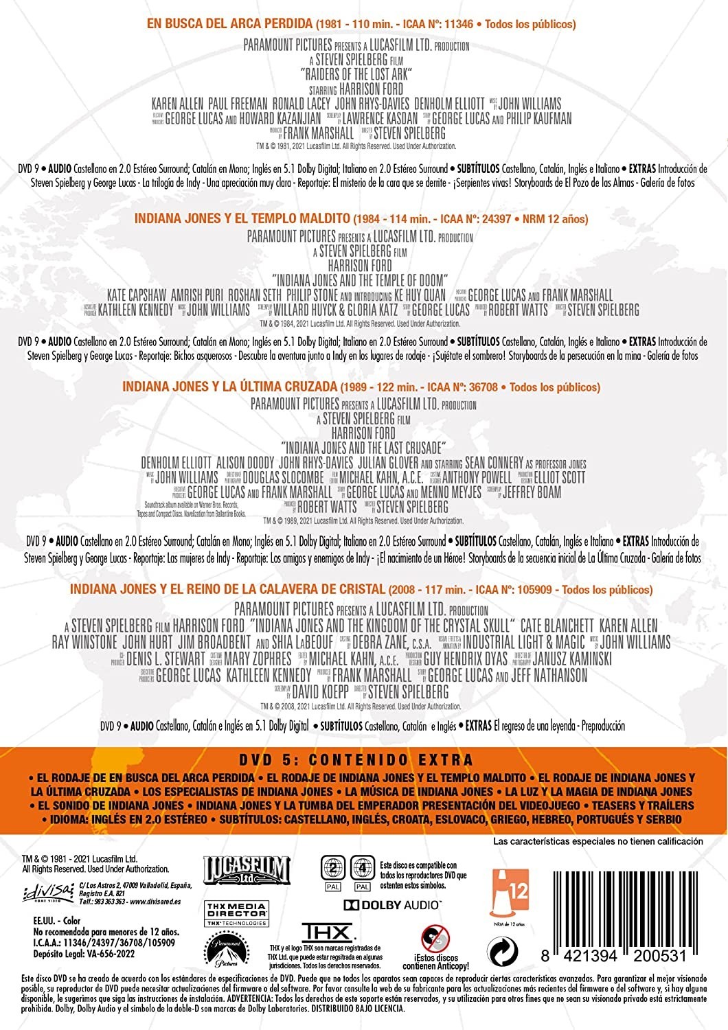 Disco Extras: EL RODAJE DE EN BUSCA DEL ARCA PERDIDA • EL RODAJE DE INDIANA JONES Y EL TEMPLO MALDITO • EL RODAJE DE INDIANA JONES Y LA ÚLTIMA CRUZADA • LOS ESPECIALISTAS DE INDIANA JONES • LA MÚSICA DE INDIANA JONES • LA LUZ Y LA MAGIA DE INDIANA JONES • EL SONIDO DE INDIANA JONES • INDIANA JONES Y LA TUMBA DEL EMPERADOR PRESENTACIÓN DEL VIDEOJUEGO • TEASERS Y TRAÍLERS • IDIOMA: INGLÉS EN 2.0 ESTÉREO • SUBTÍTULOS: CASTELLANO, INGLÉS, CROATA, ESLOVACO, GRIEGO, HEBREO, PORTUGUÉS Y SERBIO.