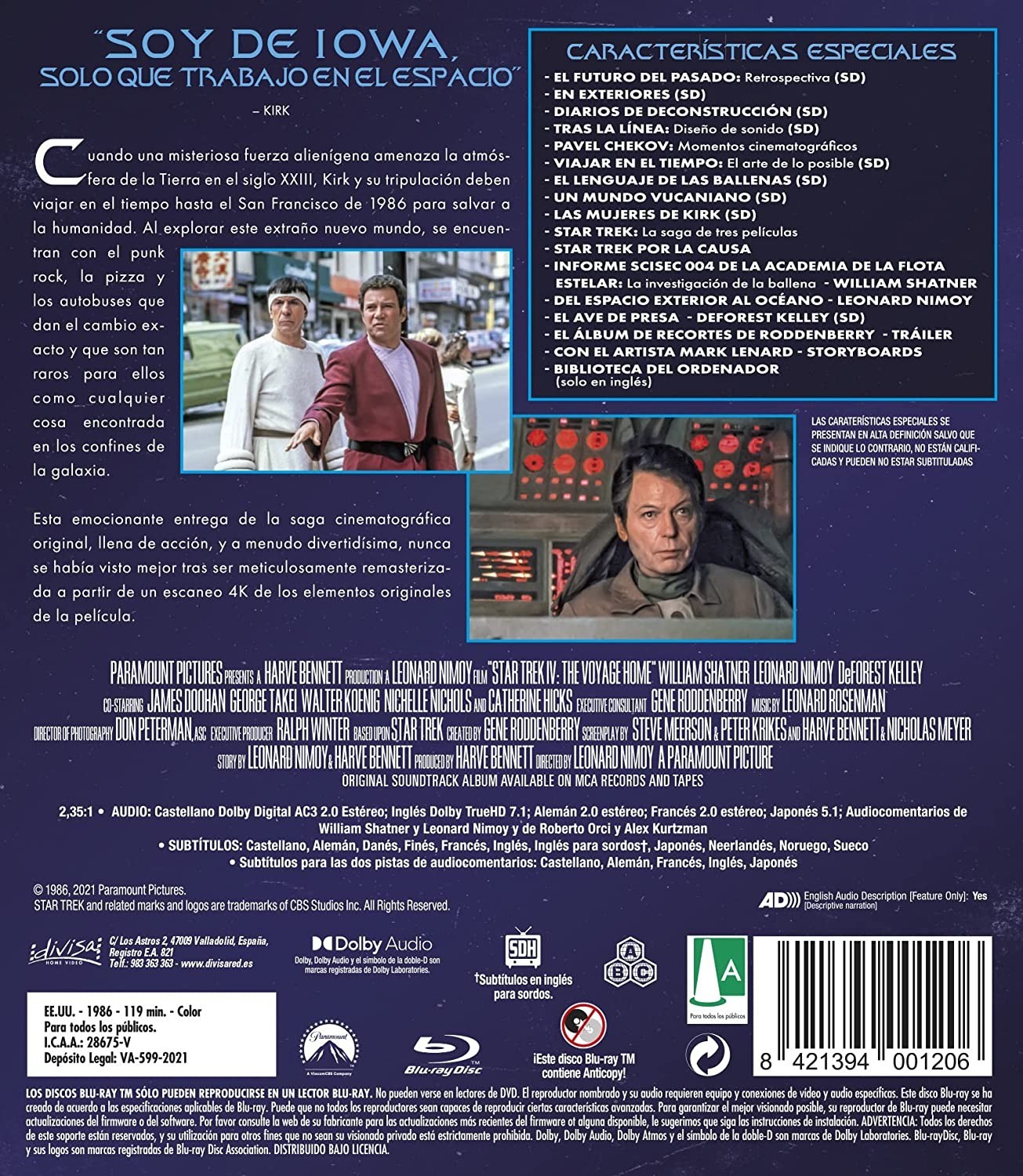 William Shatner, Leonard Nimoy y el resto de la tripulación del USS Enterprise, alcanzan cotas muy elevadas en una de las más aplaudidas e intrigantes aventuras de la saga Star Trek. Estamos en el siglo XXIII y un misterioso poder alienígena amenaza la Tierra, evaporando los océanos y destruyendo la atmósfera. En un frenético intento para salvar a la humanidad, Kirk y su tripulación viajan en el tiempo y regresan al San Francisco de 1986, encontrándose con un mundo de punks, pizza y autobuses de cambio exacto que resultan ser tan alienígenas como todo lo que se han encontrado en los lugares más recónditos de la galaxia. Una misión emocionante y repleta de acción para la nave espacial Enterprise.