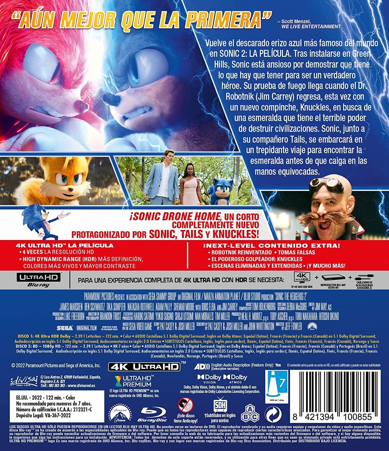 Sonic 2, La Película edición 4K UHD + Blu-ray - Después de establecerse en Green Hills, Sonic se muere por demostrar que tiene madera de auténtico héroe. La prueba de fuego llega con el retorno del malvado Robotnik, en esta ocasión con un nuevo compinche, Knuckles, en busca de una esmeralda que tiene el poder de destruir civilizaciones. Sonic forma equipo con su propio compañero de fatigas, Tails, y juntos se lanzan a una aventura que les llevará por todo el mundo en busca de la preciada piedra para evitar que caiga en manos equivocadas.