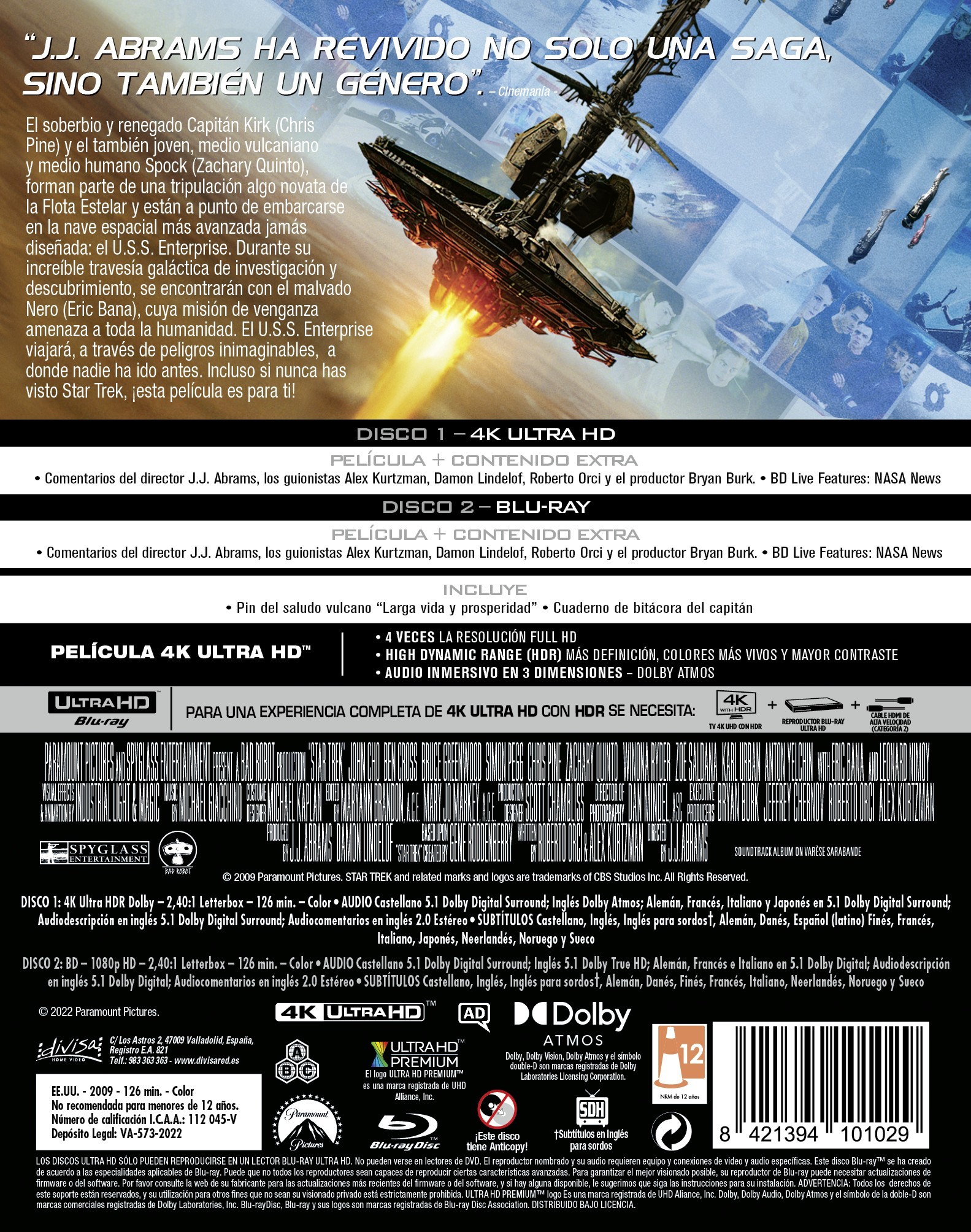 PELÍCULA + CONTENIDO EXTRA: • Comentarios del director J.J. Abrams, los guionistas Alex Kurtzman, Damon Lindelof, Roberto Orci y el productor Bryan Burk. • BD Live Features: NASA News.