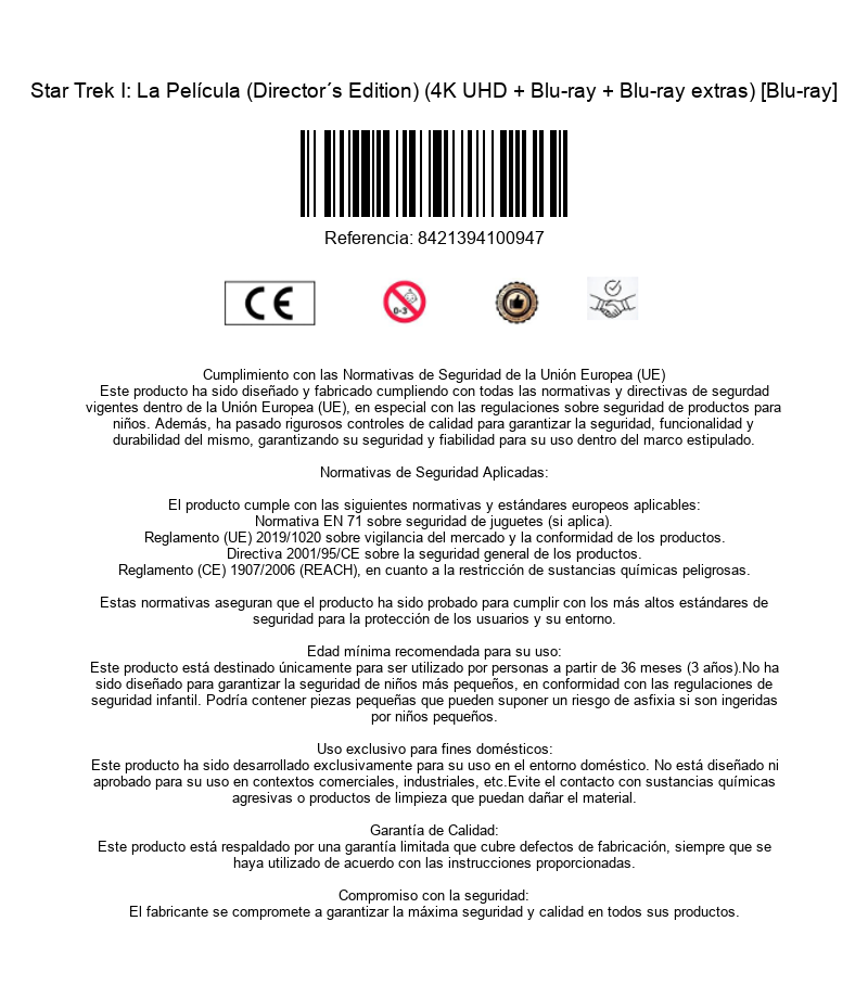 THE DIRECTOR´S EDITION a versión definitiva del director Robert Wise, esperada por los fans de STAR TREK durante más de dos décadas, está ahora meticulosamente restaurada y remasterizada en 4K Ultra HD con HDR-10 y Dolby Vision para una imagen óptima y en sonido envolvente Dolby Atmos. Este lanzamiento imprescindible cuenta con un disco Blu-ray adicional lleno de contenidos extras especiales nuevos, incluyendo un extenso detrás de las cámaras, escenas eliminadas y mucho más. La aventura comienza cuando un intruso alienígena no identificado destruye tres poderosos cruceros klingon. El capitán James T. Kirk vuelve a ponerse a los mandos de un U.S.S. Enterprise recién transformado y completamente nuevo. Esta increíble aventura lanzó al mundo una de las franquicias cinematográficas más longevas de todos los tiempos y cuenta con el reparto de la serie original de STAR TREK, incluyendo a William Shatner, Leonard Nimoy, DeForest Kelley, George Takei, Nichelle Nichols, Walter Koenig y James Doohan. CONTENIDO EXTRA (el contenido extra puede no estar en HD, no está calificado y puede no estar subtitulado): • Comentarios del director Robert Wise, los técnicos en efectos especiales Douglas Trumbull y John Dykstra, el musico Jerry Goldsmith, el supervisor de la restauración Mike Matessino, el supervisor de efectos Daren Dochterman y el productor de la edición del director, David C. Fein • Documental “The Human Adventure” • Escenas eliminadas • Pruebas de vestuario, efectos y diseños gráficos • Legacy Features • El Universo de Star Trek • Storyboards • Escenas adicionales de la versión cine 1979 • Escenas eliminadas de la versión de TV 1983 • Trailers de cine y anuncios de TV. DISCO 1: 4K Ultra HDR Dolby - 2,39:1 Letterbox – 136 min. Color • AUDIO Castellano 5.1 Dolby Digital Surround; Inglés Dolby Atmos; Alemán y Francés en 5.1 Dolby Digital Surround; Audiocomentarios en inglés 2.0 Estéreo • SUBTÍTULOS Castellano, Inglés, Inglés para sordos†, Alemán, Danés, Español (latino), Finés, Francés, Italiano, Neerlandés, Noruego y Sueco DISCO 2: BD – 1080p HD – 136 min. – 2.39:1 Letterbox – Color • AUDIO Castellano 5.1 Dolby Digital Surround; Inglés Dolby Atmos; Alemán y Francés en 5.1 Dolby Digital Surround; Audiocomentarios en inglés 2.0 Estéreo • SUBTÍTULOS Castellano, Inglés, Inglés para sordos†, Alemán, Danés, Español (latino), Finés, Francés, Italiano, Neerlandés, Noruego y Sueco DISCO 3: BD Extras