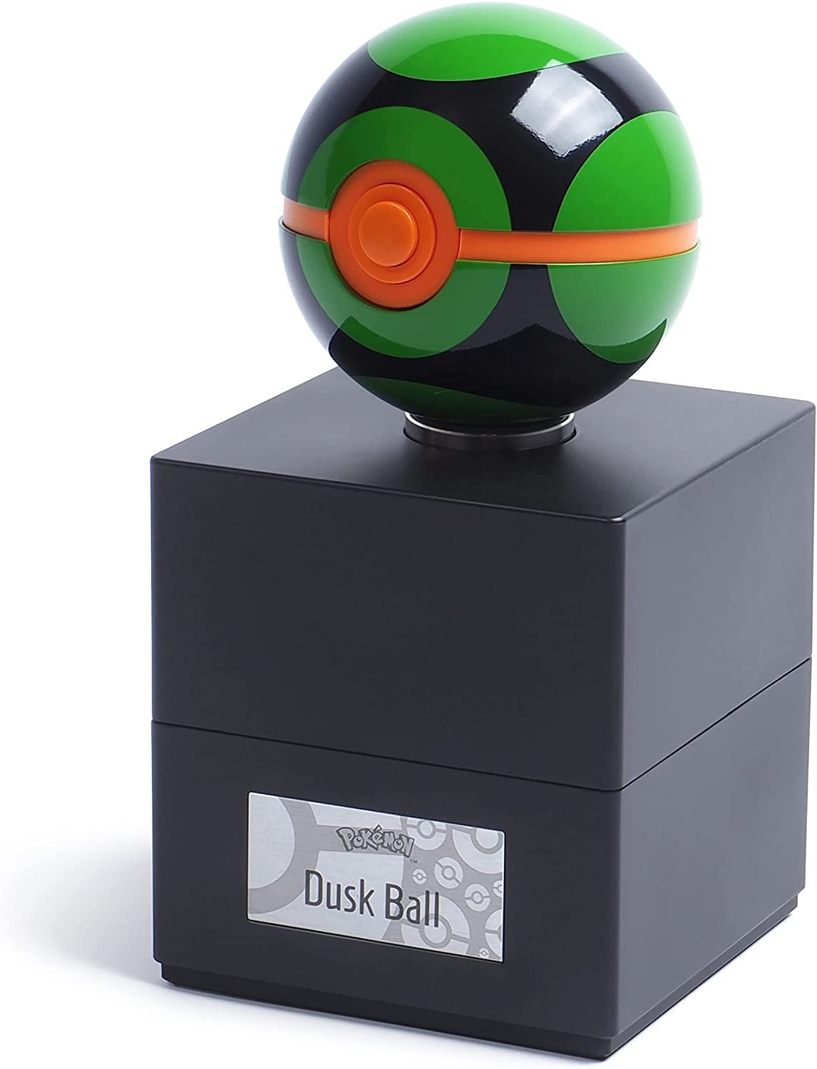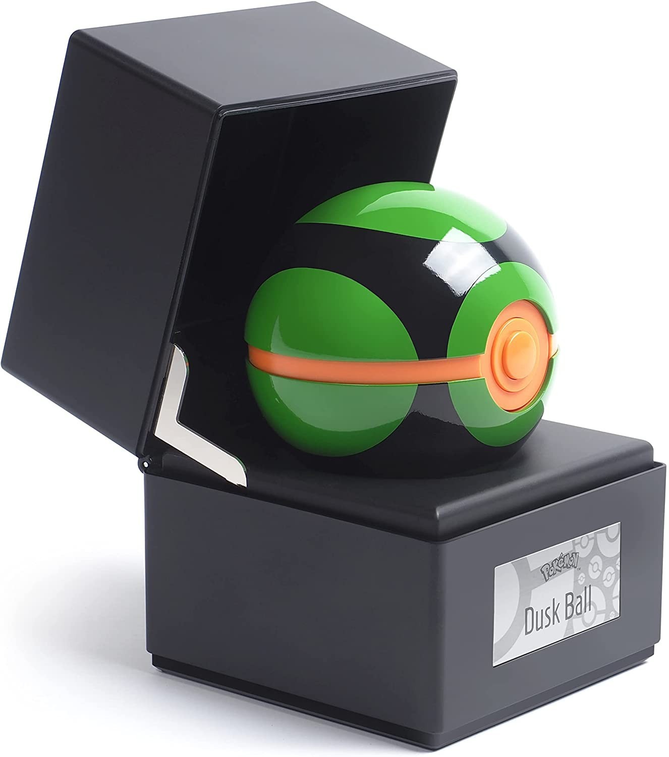 Si hay una cosa que tienen en común todos los fans de Pokémon es el deseo de ser poseedores de una Pokeball o, en este caso, una Dusk Ball. Estas herramientas que usan los entrenadores Pokémon para atrapar a las criaturas son icónicas y han pasado a ser parte de la cultura popular. La marca The Wand Comany ha creado esta espectacular Dusk Ball verde, negra y naranja que se ilumina al acercar tu mano. Está hecha con un recubrimiento de diecast metálico y tiene un acabado brillante, pulido y metalizado increíble. Es una réplica a escala 1:1, el tamaño que tendría una Dusk Ball en el mundo real, lo que son unos 8 cms de diámetro. Es un producto de licencia oficial sensible al tacto y a la proximidad, por eso el botón se iluminará cuando te acerques. Viene dentro de una lujosa caja para exposición que tiene luces multicolor que brillarán cada vez que abras la caja. La caja mide unos 9 x 10 x 10 cms y tiene una etiqueta holograma en su parte inferior con un identificador y numeración única. También incluye un pequeño aro de acero inoxidable para que puedas colocar la Dusk Ball en exposición fuera de la caja. Los efectos luminosos funcionan gracias a 6 pilas AA que están incluidas. Colecciona esta magnífica pieza de lujo y colócala junto a las otras Pokeball de la colección.