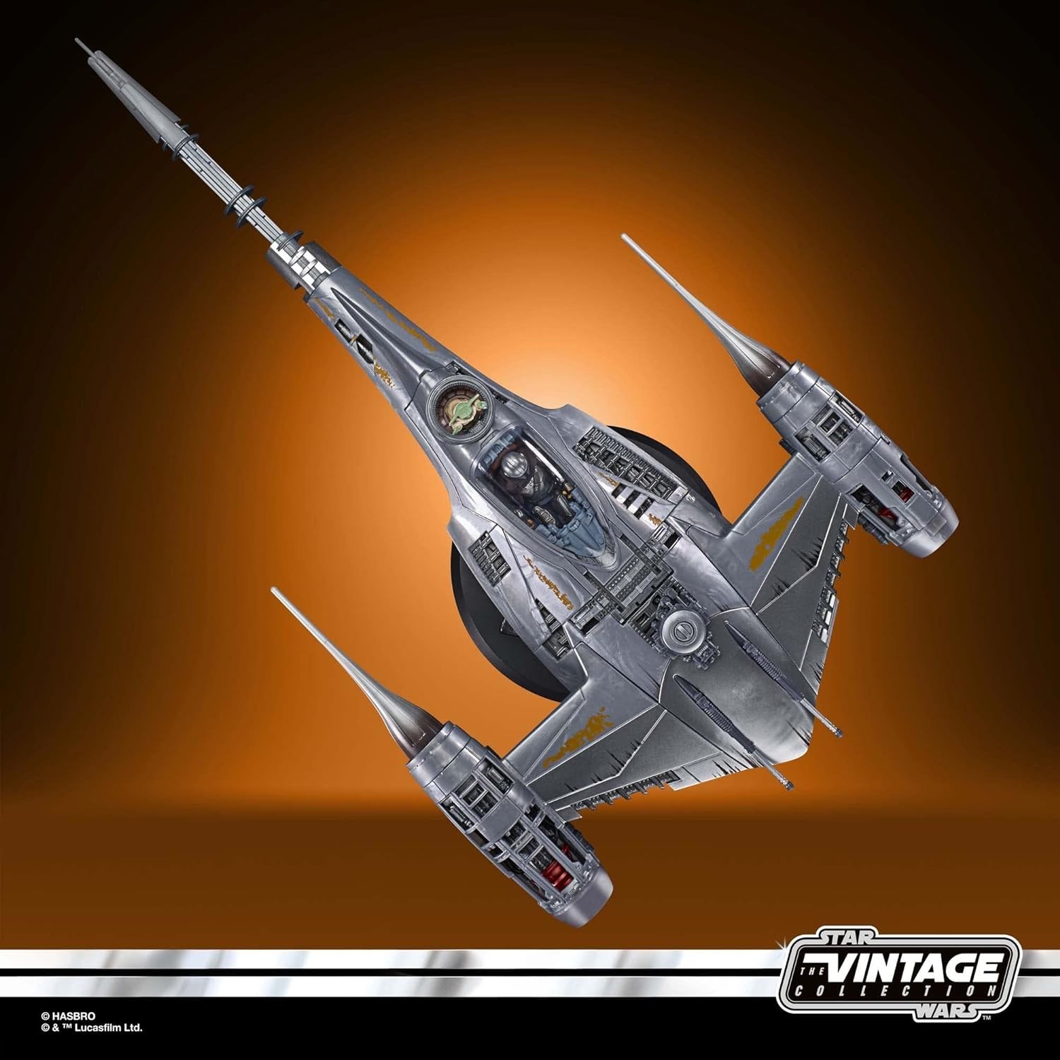 El Mandaloriano Din Djarin, el protagonista de la serie de Disney + “The Mandalorian”, cuenta con un par de vehículos molones para moverse por la galaxia. Una de las naves que usa es la N-1 Starfighter, reutilizada de los restos de un caza estelar de Naboo. Con su pintura amarilla desgastada y ahora siendo casi por completo una bala plateada, el Starfighter tiene una plaza para Grogu y otra, la de piloto, para Din. Esta (enorme) caja incluye accesorios como figura de 9,5 cms de Din, figura de Grogu, jet-pack bláster láser, peana de exposición y un par de herramientas de mantenimiento. La nave tiene una escala para que quepa perfectamente en la cabina una figura de 9,5 cms como la que viene aquí. Es una creación de licencia oficial de Hasbro y Kenner.