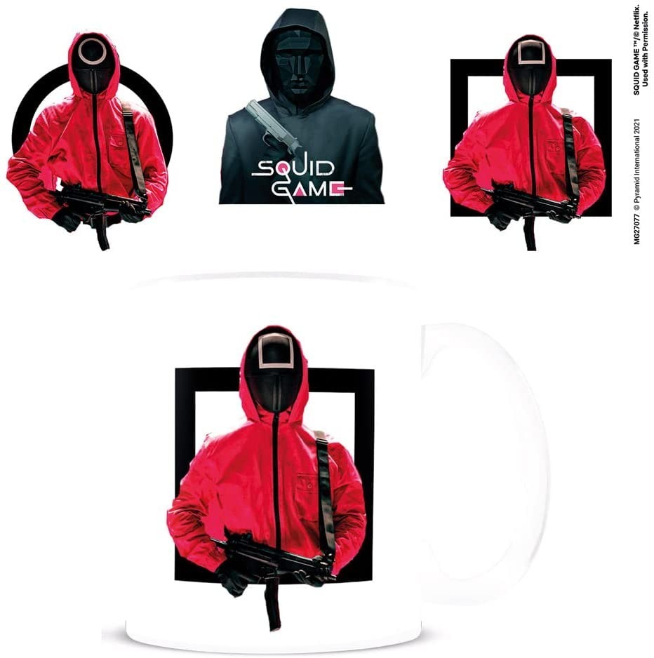 La marca Pyramid International, famosa por sus útiles productos de gran calidad te trae esta taza de cerámica de licencia oficial de la serie de Netflix "El Juego del Calamar". En esta pieza vienen tres imágenes de los misteriosos soldados que mantienen el orden en el juego. También viene en la superficie de la taza una imagen del logo de la serie para que si algún despistado la ve tampoco le quepa duda de a que producto pertenece. Si te gustan las tazas coloridas y el mundo que creó Hwang Dong-Hyuk, ahora puedes desayunar sintiéndote un personaje más, pero con la tranquilidad de que no correrás el mismo destino que ellos. Tiene una capacidad de 315 mls.