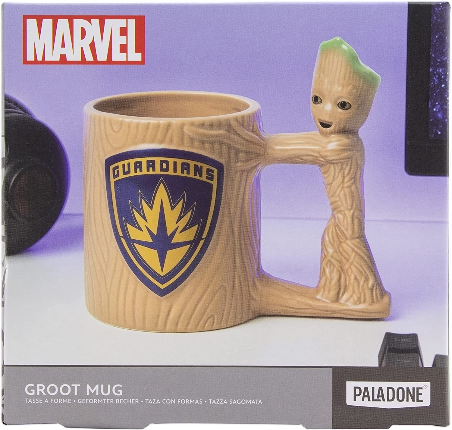 Paladone ha viajado a bordo de la Milano, la nave de Star-Lord, e inspirándose en ese viaje a través del espacio ha creado una espectacular taza temática. Hecha de cerámica, tiene un mango con relieve 3D que es el mismísimo Baby Groot tal y como aparece en la película “Guardianes de la Galaxia Vol. 2”. En el exterior del cilindro de la taza hay una ilustración del escudo/símbolo de los Guardianes de la Galaxia. Esta divertida taza coleccionable tiene una capacidad de unos 350 mls, más que suficiente para beber de tu bebida favorita en cualquier evento o reunión familiar o de amigos. Es un producto de licencia oficial y viene en una caja temática de Marvel.