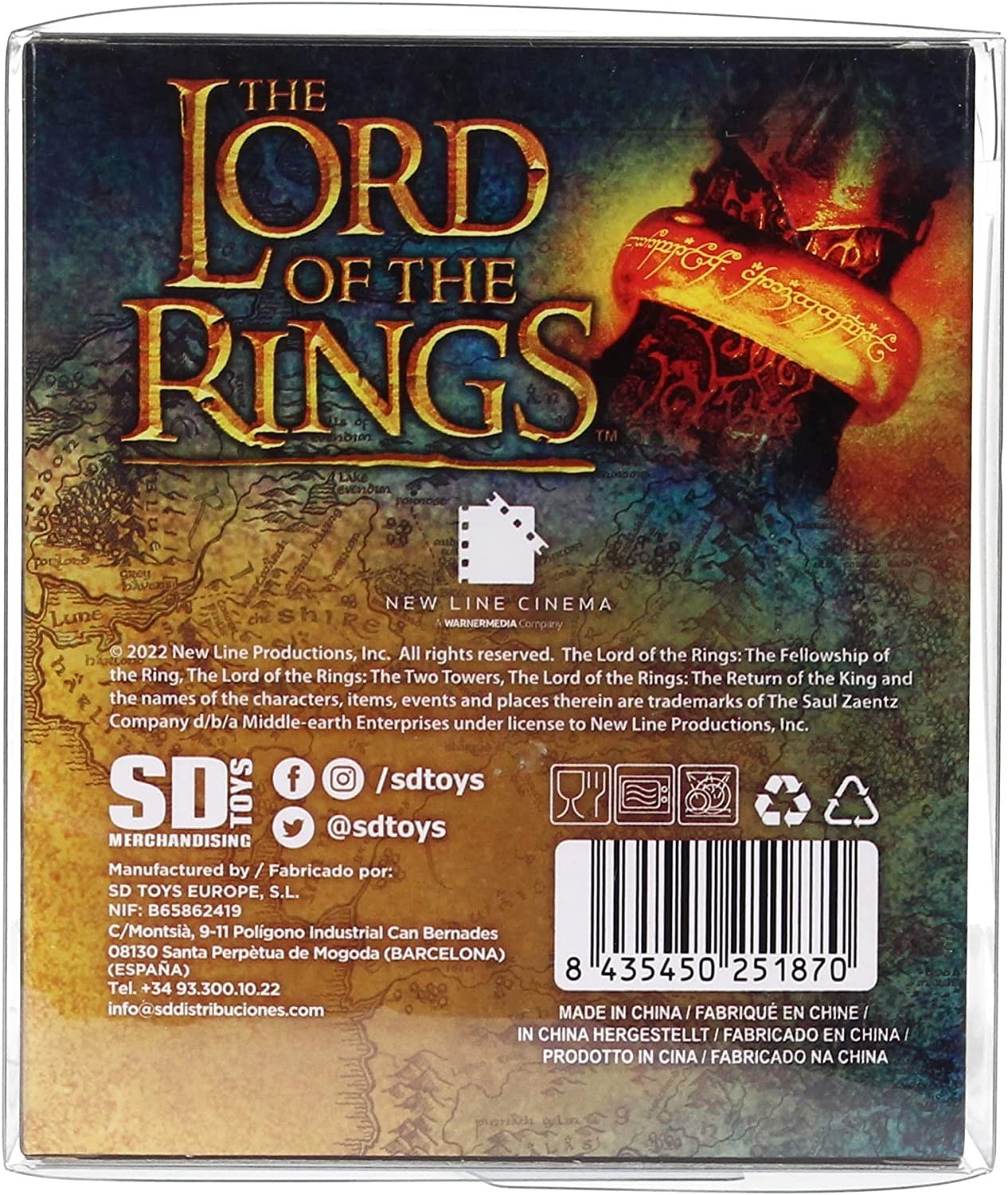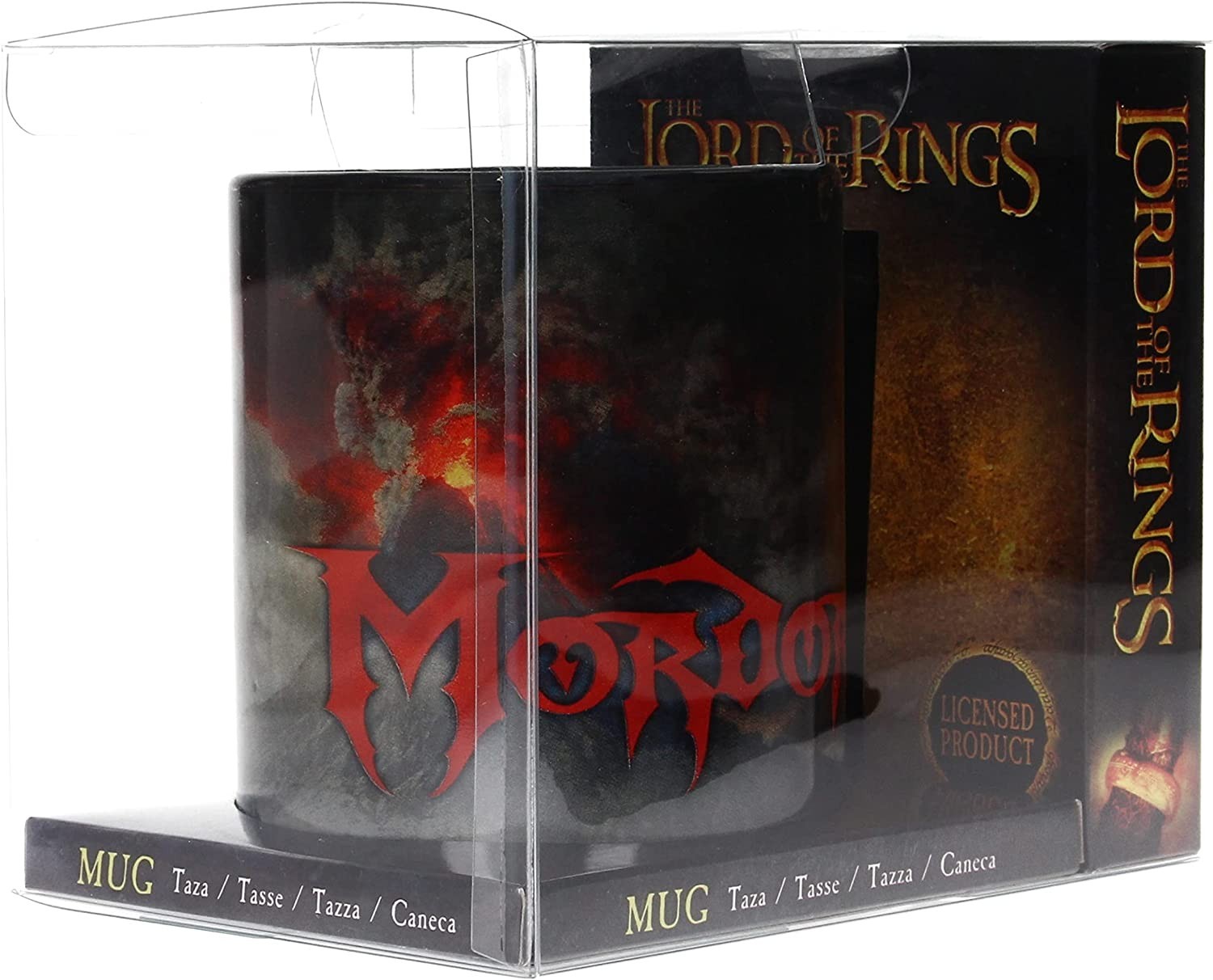 Un anillo para gobernarlos a todos y a atarlos en las tinieblas, en la tierra de Mordor, donde se extienden las sombras… Y con esta taza de SD Toys y licencia oficial de El Señor de los Anillos, tu también podrás sentir ese temible poder en tus manos cada mañana. Viene en una caja transparente para que la veas igual que los espectros del anillo veían a Frodo cuando este se ponía el preciado aro. Tiene una ilustración impresionante de Mordor y es apta para lavavajillas y microondas. Está hecha de cerámica y tiene una capacidad aproximada de 320 mls.