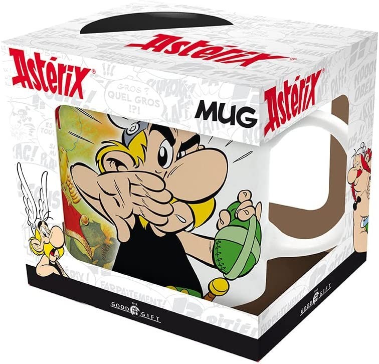 El galo de baja estatura per gran coraje, Astérix, sale en una ilustración a todo color en la superficie de esta taza de licencia oficial de Astérix y Obélix que ha creado la marca especializada The Good Gift. Viene en una caja temática con imágenes de los personajes. Además de Astérix, en la taza también viene una ilustración del mapa de la aldea gala que protege (su hogar) y de sus alrededores. Está hecha de cerámica y tiene una capacidad de 320 mls. Es apta para usar en lavavajillas y microondas.