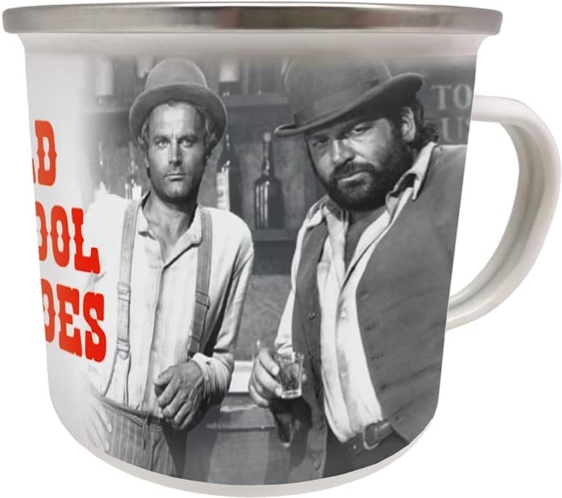 Old School Heroes, o, Héroes de la Vieja Escuela. Si hay un dúo que ejemplifica mejor ese dicho, son sin duda alguna Bud Spencer & Terence Hill. Los mamporreros y buscavidas del salvaje oeste llegan a tus desayunos con esta taza metálica de unos 330 mls de capacidad. No es apta para microondas, pero si para fardar de tu pasión por el cine de estos dos iconos con esta taza que tiene una foto de los dos en su superficie y la frase “Old School Heroes” en rotundas letras rojas del Far West.