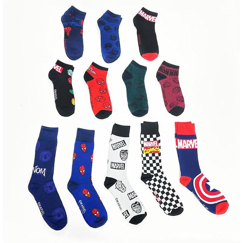 ¡Atención, héroes y heroínas! Esta caja de edición limitada de 12 pares de calcetines de Marvel Cómics es todo lo que necesitas para llevar el poder de tus personajes favoritos… ¡en tus pies! Cada par es un homenaje a todo color al universo Marvel: desde el intrépido Spider-Man balanceándose entre edificios, hasta el Capitán América con su estilo retro. Hechos de un poliéster increíblemente cómodo, estos calcetines son ideales tanto para salvar el día como para relajarse tras una larga batalla (o un día en la oficina). Con estilos distintos cada día, podrás hacer equipo con un nuevo héroe cada vez. Perfectos para fanáticos de Marvel y cualquier amante de los cómics. ¡Úsalos y demuestra que, cuando se trata de estilo, tienes el poder! Son una creación de la marca Cerdá, en la que son expertos en hacer los artículos textiles de la mejor calidad.