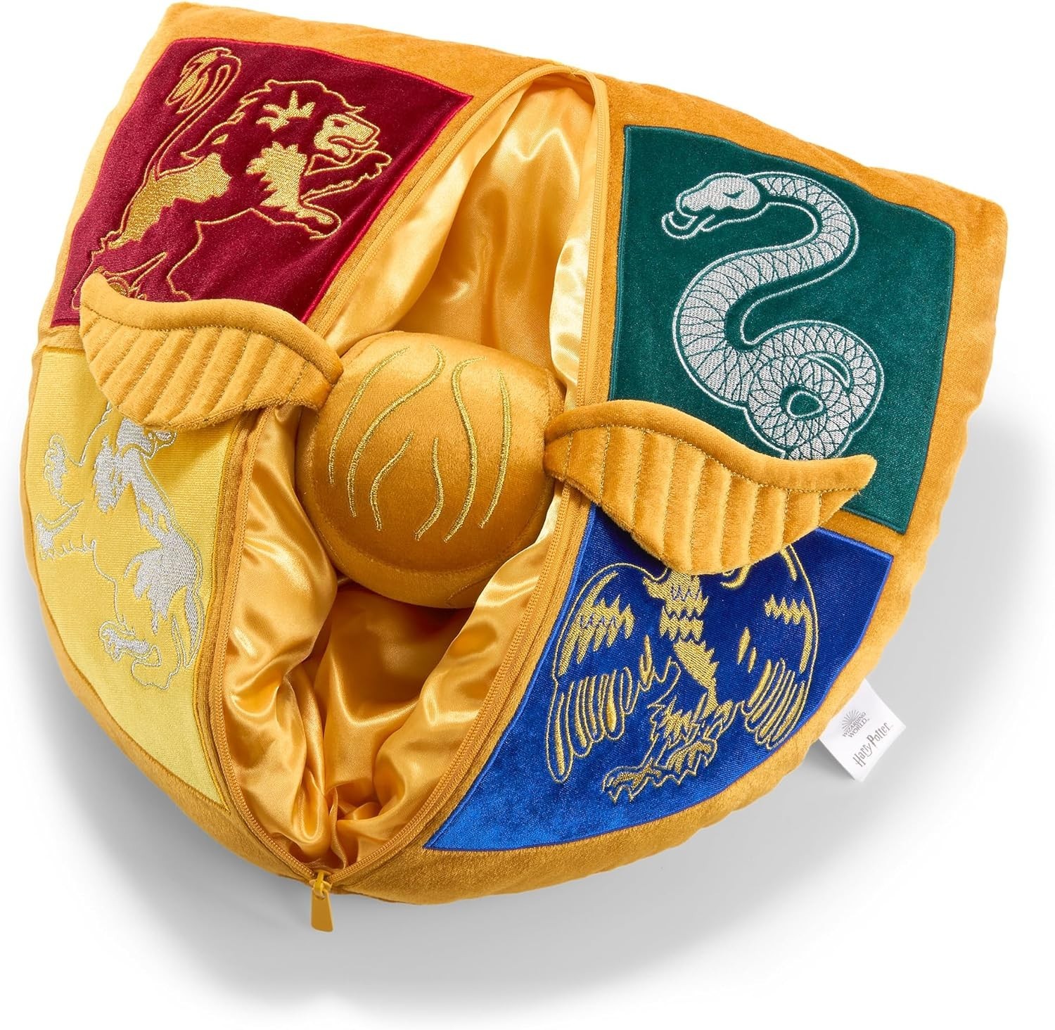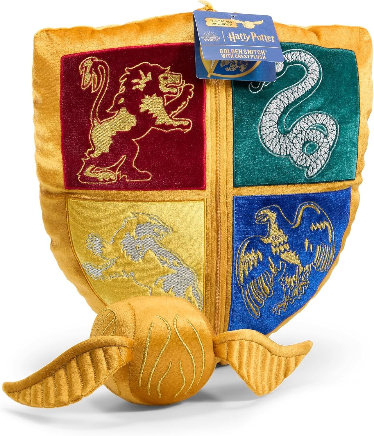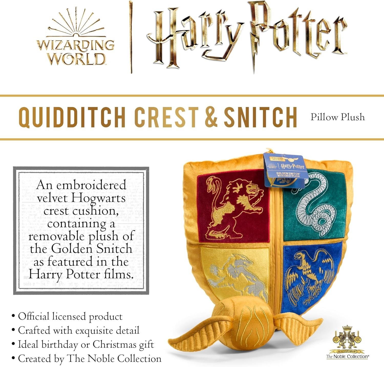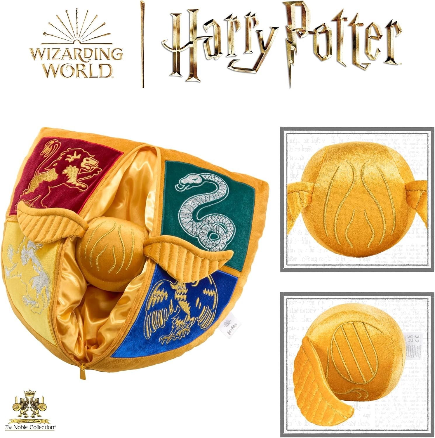 ¡Un set mágico de cojines!, ¡la Snitch Dorada y el Escudo de Hogwarts! Este encantador set de cojines es el accesorio ideal para cualquier fanático del mundo mágico de Harry Potter. Fabricados en suave poliéster por The Noble Collection, ofrecen una combinación única de comodidad y estilo para transformar cualquier rincón en un espacio digno de un mago o bruja. La Snitch Dorada (14 cms) es compacta y detallada, este cojín recrea la icónica pelota alada del Quidditch. Sus alas extendidas y su brillante color dorado la convierten en una pieza única que captura toda la emoción de este deporte mágico. El Escudo de Hogwarts (35 cms) es un cojín más grande presenta el famoso escudo de la escuela de magia, con los emblemas de Gryffindor, Slytherin, Hufflepuff y Ravenclaw, y el lema "Draco Dormiens Nunquam Titillandus". Con colores vivos y detalles impecables, es un tributo perfecto al hogar de generaciones de magos y brujas. Perfectos para decorar tu cama, sofá o área de lectura, estos cojines añaden un toque de magia a tu espacio mientras te envuelven en comodidad. ¡Un set imprescindible para quienes sueñan con Hogwarts y el Quidditch!