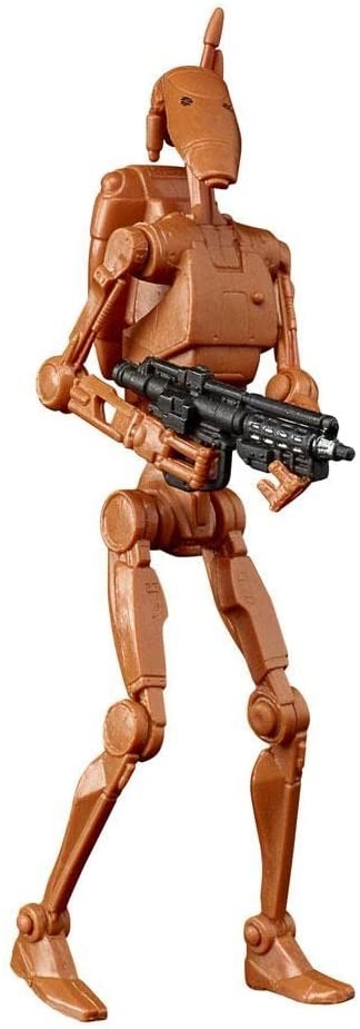 La marca Hasbro y Kenner te traen uno de los droides más icónicos de la historia de las Guerras Clon, el Battle Droid de la Federación de Comercio. Es de color rojo, está completamente articulado e incluye mochila de comunicación, antena y rifle láser. La figura de acción mide unos 10 cms, está hecha de PVC y viene en el clásico blíster negro que ha hecho (aún más) famosas a las figuras de Star Wars. La serie "The Clone Wars" nos ha dado una variedad enorme de personajes novedosos y versiones nuevas de los androides y aliens que ya conocíamos, el Battle Droid es un ejemplo más del torrente de imaginación que supuso la serie animada de Lucasfilm. Y hablando de Lucasfilm, esta figura es una de las que se crearon como celebración del 50 aniversario de la productora creada por George Lucas.
