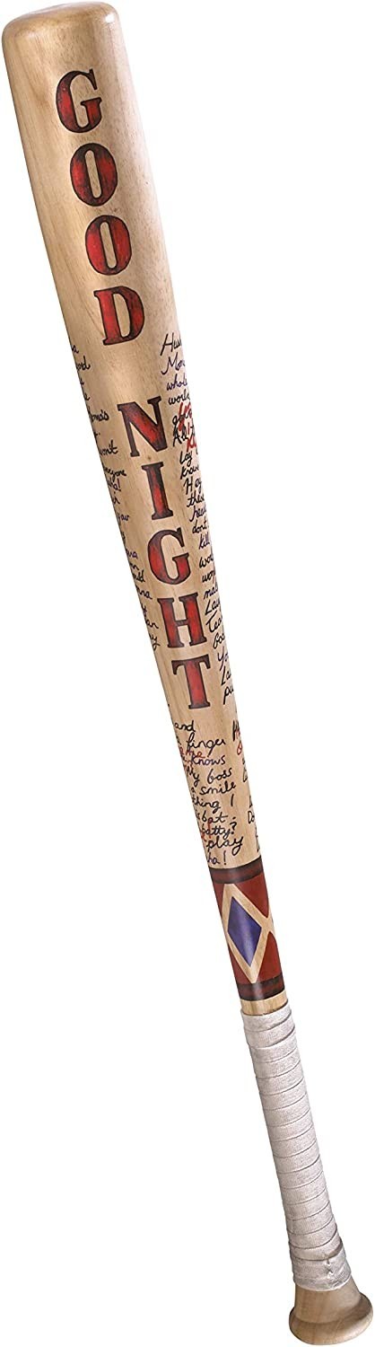 Good Night… No, no te mandamos a la cama, eso es lo que pone en este artículo. Por fin ha llegado la réplica perfecta del auténtico bate de béisbol que Harley Quinn portaba en la película "Escuadrón Suicida" dirigida por David Ayer. The Noble Collection te trae este bate de madera que viene en una caja temática con una ilustración de Harley. El bate tiene todos los detalles de el de la cinta: venda, frase de buenas noches, texto, dibujos de rombos azules y rojos, etc. Lo que tu cosplay de Harley o tu colección necesitaba y no encontrabas, aquí lo tienes. Gotham City te espera...